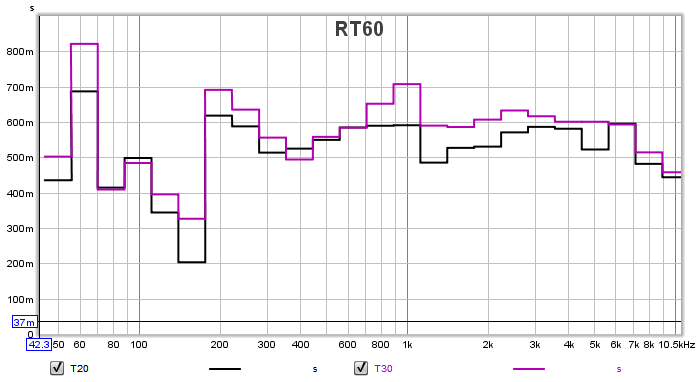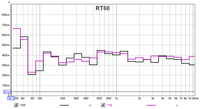 You have also greatly improved the over decay times. Here's two graphs, firstly from the baseline test: and now the most recent one: This is remarkable! you have greatly smoothed out the decay times, and reduced them from a rather live 530 ms to a very usable time; around 350 ms. But the best part is the smoothness: all of your decay times for all frequency bands are within about +/-70ms, which is unusually good for a small room like that. What often happens when treating rooms like yours is that the room ends up too dead, and with a deep dip to very short decay around 200-400 Hz. But you didn't get that, which is great. You could probably add a little more general broadband absorption if you wanted to, and bring the times down a bit more, as they are still a bit long for a small room like that. I would shoot for something a bit under 300 ms. Maybe around 250 or so.