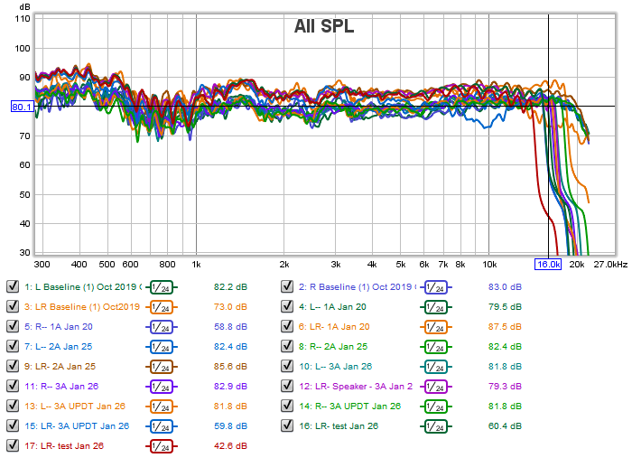 One strange thing that struck me, is that there is no "very high end": All of your most recent graphs show a sharp drop-off at about 16 kHz (it varies between graphs: some as low as 13 Khz, others up around 18 kHz.) That was not the case for the Jan 25 tests, or for Baseline tests, way back in October: those had more normal high end. So the first question is: do you know why that might be? It's sort of like there's a very steep low-pass filter that has been applied to the signal, then adjusted up and down a bit between tests. Any idea what that might be? It needs to be fixed, since you are missing the top end.