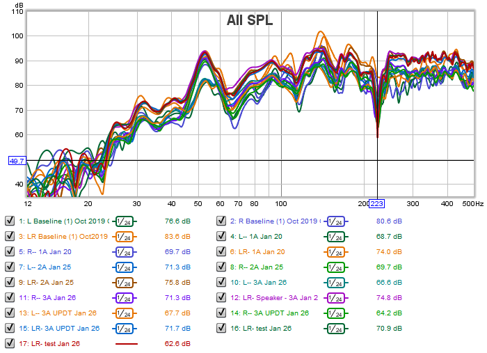 You have a large dip at around 223 Hz in all of your tests, going right back to the early tests, and for all speaker combinations. 223hz-dip.png This is very likely a phase cancellation from a reflection. The graph below is a close-up of that, and shows phase (dotted green) in addition to the plain frequency response (red), and you can see how the phase suddenly shifts through about 180° at that same point.223-phase-flip.png A clear sign that this is a phase cancellation from a reflection. So I would suspect a floor bounce, ceiling bounce, or SBIR. It's probably not SBIR from the front wall, since you have your speakers very close to the front wall (too close to account for a frequency of 225 Hz, I think), so it is probably something else. To help you figure out what that is, I would suggest doing this "walking mic" test (click here to find out about that). Strangely enough, this dip was not so evident in your original Baseline test, but that might be for other reasons.