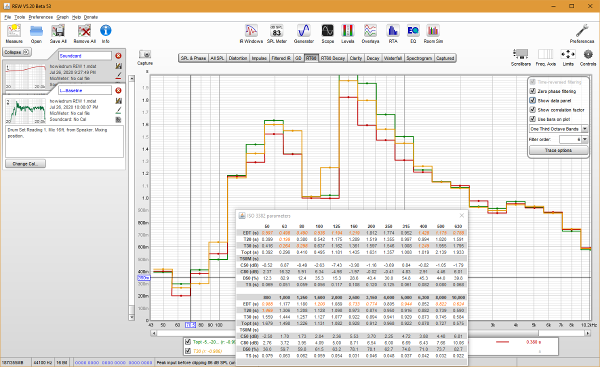 I did my calibrations and made my first test. I am just uploading one file to see if I did everything ok before doing more tests. Since this is a tracking room, I only used one speaker. I positioned the speaker where I envision my drum set going, so there is not a L baseline, R baseline, L+R baseline. Just left baseline.