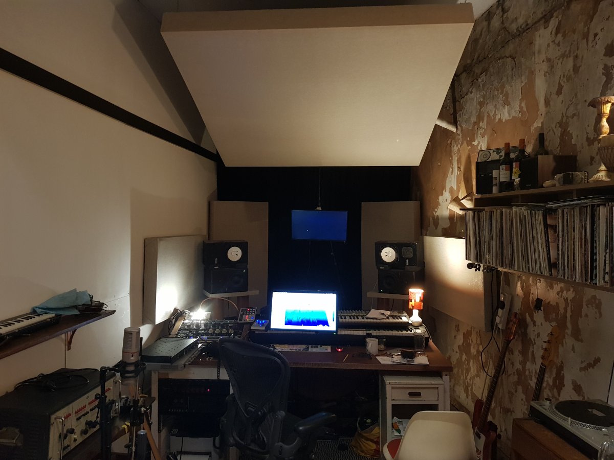 From the back of the speakers to the wall is 64cm. When I first set up in the room I tried them closer in various positions and this is where they sounded best. Also because of the narrowing walls, to have them closer to the wall means having them closer together which in turn means sitting closer to them and the whole thing starts to become unergonomic. I'm actually about to replace the monitors (Dynaudio BM6A's) with Barefoot MM45s, which is what is spurring on this whole acoustic refurb. (if you're going to have great speakers, better have a great room hey?) The MM45's are bigger in size and I really don't think I'll get away with having them closer together than I currently have the Dynaudios. I see sofit mounting is popular here and I appreciate that it is the ideal solution to boundary interference. I'll certainly look into it, I've seen a number of build threads with them and I'm concerned that I don't have the space to play with, also I'm wondering if speakers are easily removed from sofits as I want to be able to easily take my monitors out of the studio when needed (I do location work too).