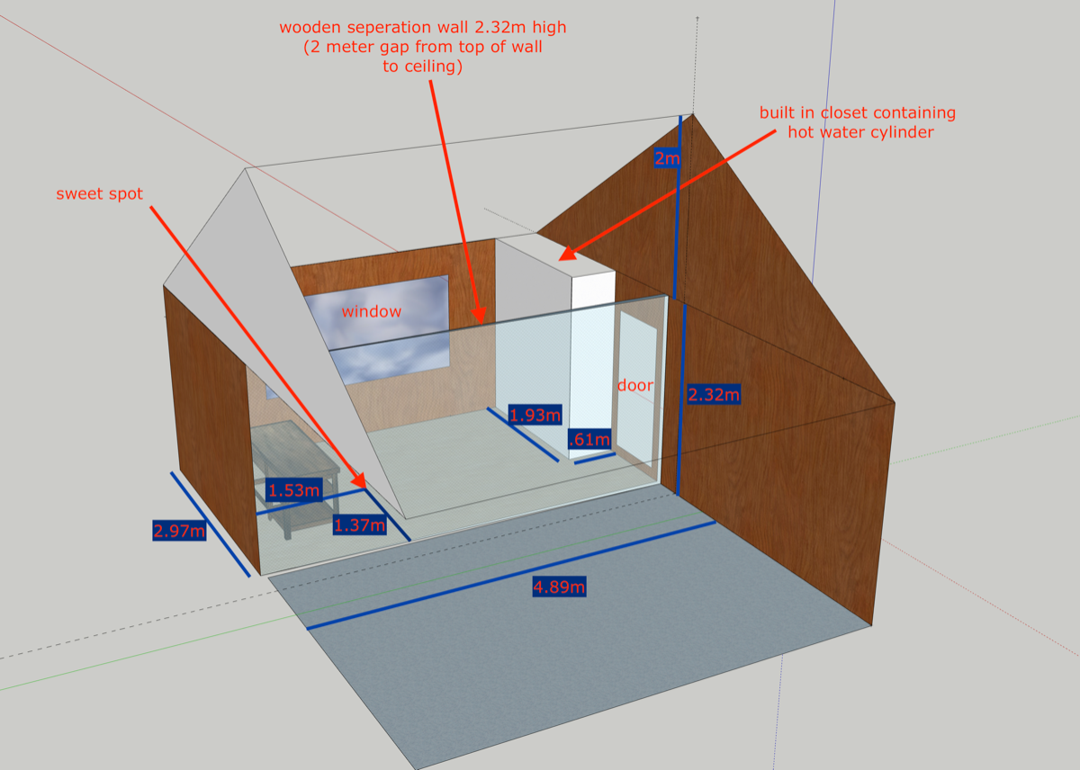 My issue now is that I would like to create a decent mix space in this room if possible. The dimensions of the room after internal construction (in inches):