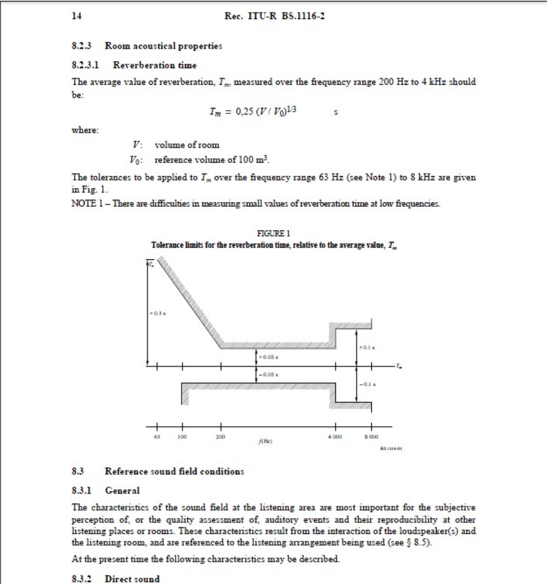 That's a very decent size for a control room, and falls within the dimension range specified in BS.1116-3. It should be possible to get the results show in that document, in your room, with suitable treatment. For example, here's the results from a we-designed and carefully tuned control room, showing what can be achieved with a lot of effort: Decay times: Frequency response: And from a different room, much smaller than the above: So it is possible to achieve those specifications, and they are necessary for top quality critical listening rooms.refers to my control room which is a bit bigger, about 5 meters x 4 with a height of 270 cm,