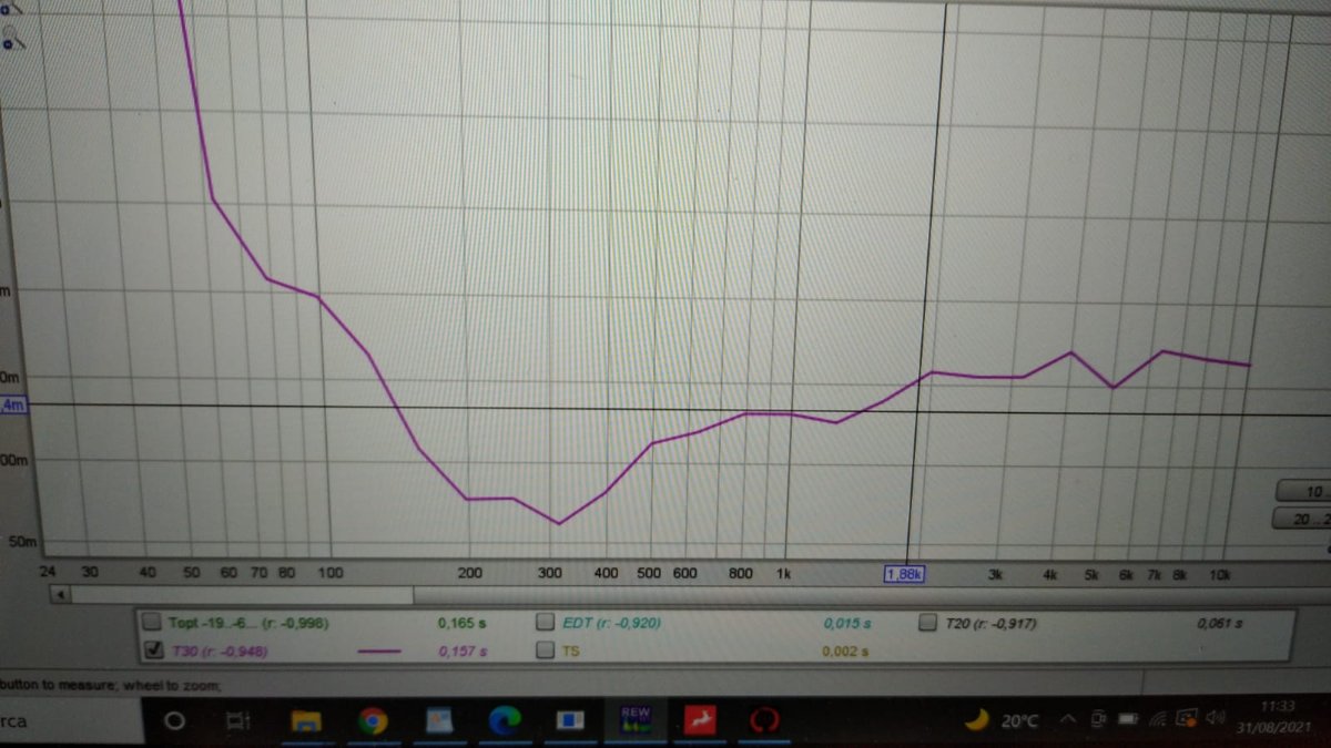 the rt30 image I sent you refers to my control room which is a bit bigger, about 5 meters x 4 with a height of 270 cm, the whole ceiling is completely absorbent with 20 cm of rock wool, the the wall where the study desk is located is completely absorbent, the opposite wall has slat walls and the two side walls are almost completely reflective. As you can see, although I have not put many wooden staves, the rt30 shows that an unbalanced response of over 150ms, with a minimum value of about 80ms around 200 hz up to about 230 ms on the high frequencies. So if I see the rooms of gervais rod or john sayers using a lot more wooden slats, I assume that the rt30 will be even more unbalanced, by the way I noticed that john puts plastic on all the treated surfaces, so purposely their projects have a very unbalanced decay time which is perhaps the secret of their sound.