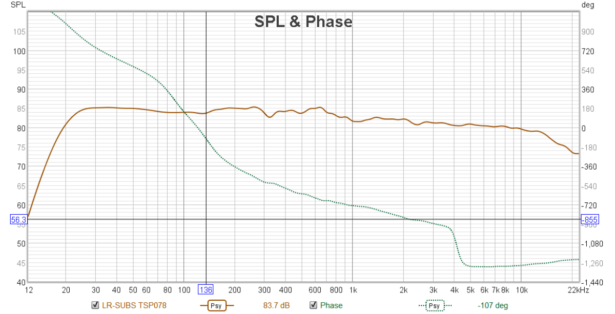 Frequency response and phase response (full spectrum, 12 Hz to 22 kHz):