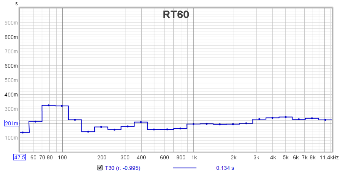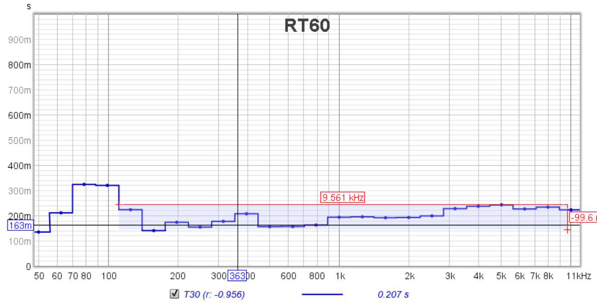 In fact, the room meets the +/-50 ms specification over a far wider frequency range that the spec calls for: from nearly an entire octave lower (120 Hz) to 2 1/2 octaves higher (20 kHz, all the way to the top of the spectrum):
