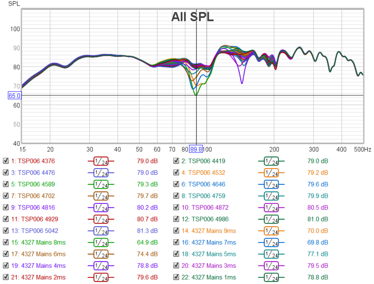 This graph shows the frequency response curves for a room I'm working on right now, with a pair of subs, carefully located at different spots along the side walls, close to the front wall: the various color traces show the results from ONLY the timing differences. Each line is for a slightly different time delay between the two subs (fractions of a millisecond) and between the subs and the mains (milliseconds). As you can see, using subs to tune a room is a very powerful tool, when done right. The concept here is sometimes referred to as a "plane wave bass array". In this case, it's not really a full plane wave array (that needs at least 4 and preferably 8 subs to do it right), but the same underlying principle applies. And obviously, it works very well! You can see, very clearly, how small timing adjustments completely remove the 89 Hz dip, as well as the 140 Hz dip. In both cases, there's a massive 15 dB difference between the tuning extremes. It is possible to get a good range of adjustment just with timing, but you get even more control when you physically move the subs as well. Timing only adjusts the relationship between the speakers, while physically moving the subs also adjusts the relationship between the sub and the room boundaries, and that is an even more powerful method of tuning the low end of a room. (For the graph above, the optimal sub positions had already been found before we did these timing tests, so those differences are ONLY due to minor changes in timing between speakers).