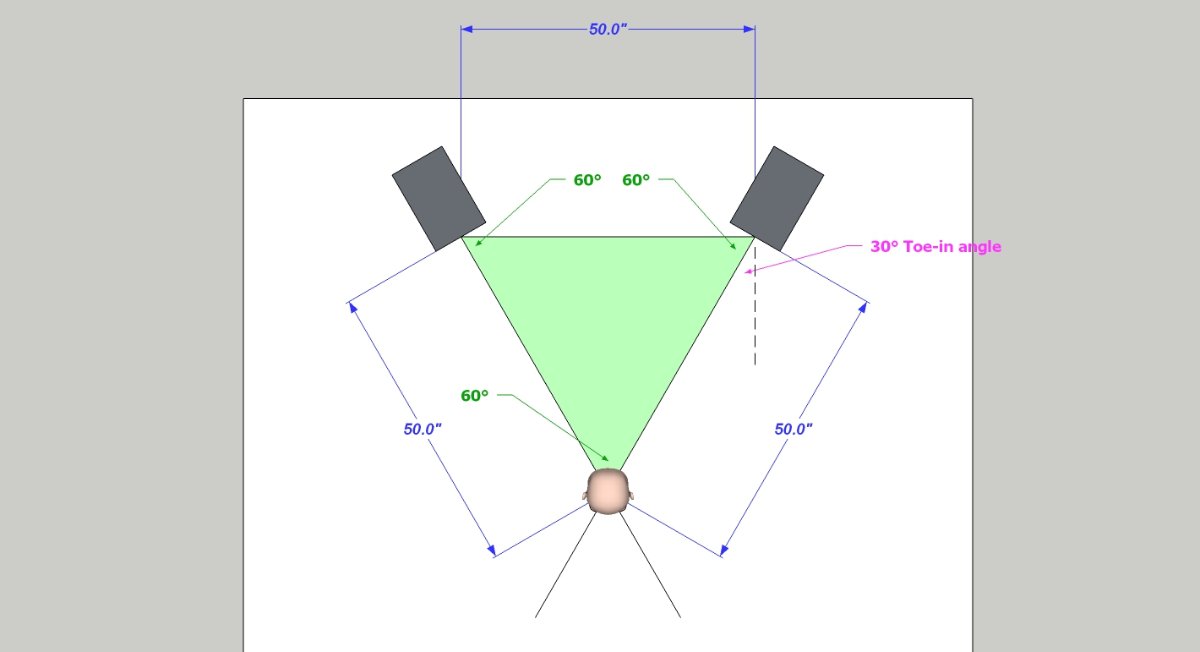 That's how much you would have to rotate your speaker to get this setup, if you started with the speaker aiming straight down the room, not angled at all. For the famous "equilateral triangle" setup, the toe-in angle is 30°, as you can see above.