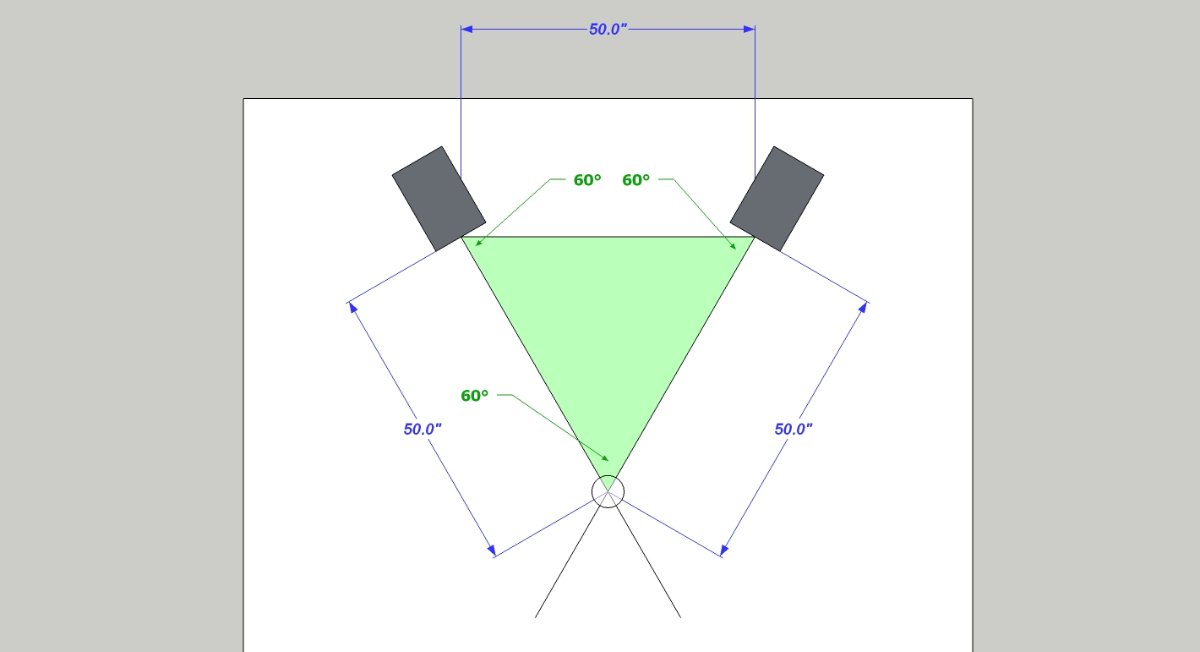 There you have it: the angle for each corner of the triangle is 60°. Equilateral. The speakers are 50" /127cm) apart in this hypothetical setup, and the distance from each speaker cone to the apex of the triangle is also 50". Equilateral. I chose those distances for simplicity, because in most small home studios, that's about the way things commonly end up.
