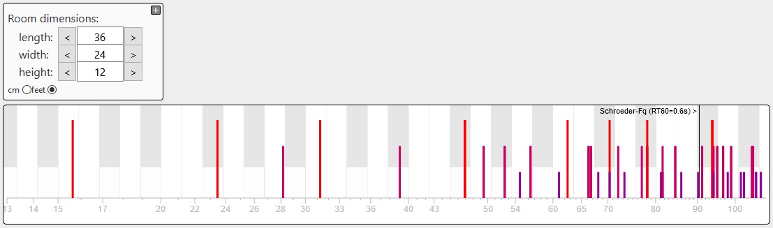 That's where "room ratios" come in: The entire point of looking for a good room ratio, is to find a set of dimensions for your room that spreads out the available modes as evenly as possible among the notes in the low end of the scale. The idea is to try to make the room have at least one mode for each note, down as low as you can. And the other big point is to NOT have modes that line up with each other, as that would make that note ring twice as loud and twice as long. So "room ratios" is all about fiddling with the dimensions to get the modes into good places on the low end of the spectrum: keep them spread out evenly and smoothly, without being bunched up in some places, or having large gaps between them in other places.