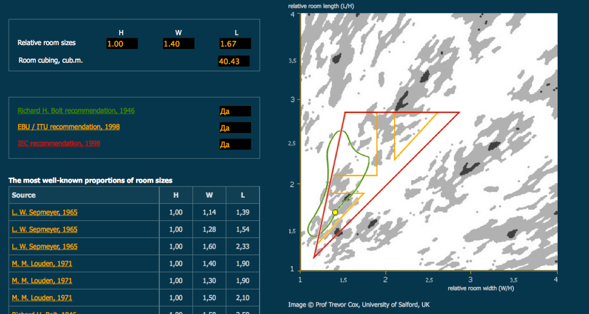 The red triangle outlines the set of ratios recommended by the IEC, the orange triangles outline the set of ratios recommended by the EBU, and the green one is the original Bolt diagram, the white areas in the background are predicted by computer simulation to be really bad, the light gray areas are predicted to be somewhat good (fairly even spread), and the dark gray areas are predicted to be very good. Perhaps the best conclusion you can draw from this, is that if your ratio is within one of the areas where all four sets of "good" overlap (Bolt, IEC, EBU and dark gray), then you should be great! But as you can see, there aren't many of those! In fact, there is just one very small patch where they all coincide. Here's a link to the actual calculator show in that diagram above: http://www.acoustic.ua/forms/rr.en.html