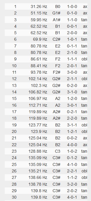 That shows the first 30 modes for a typical room. The first column on the left of that table is just the number of the mode, the second column is the frequency, the third one is the closest musical note, the forth one is the mode "name" or "index" (more about that in the paragraph below), and the last column tells you what type of mode it is: axial, tangential, or oblique.