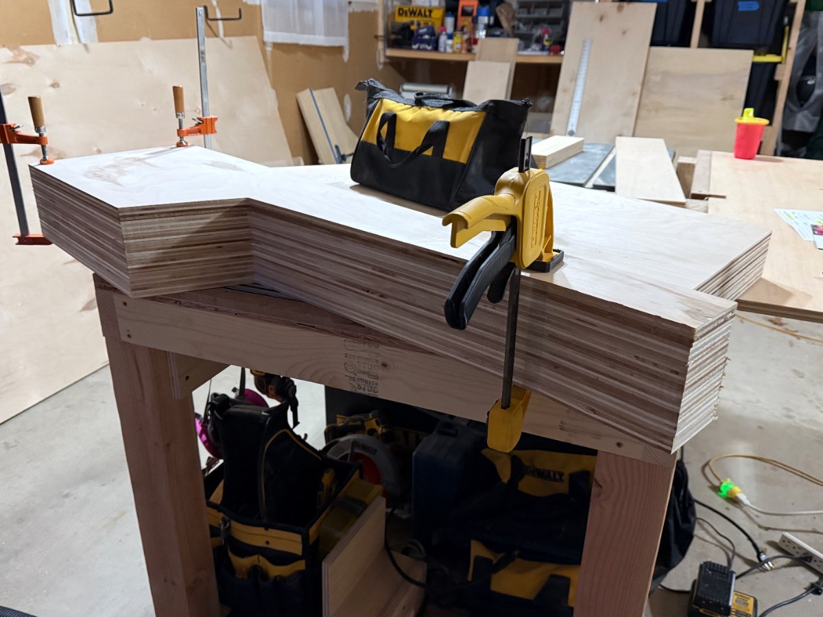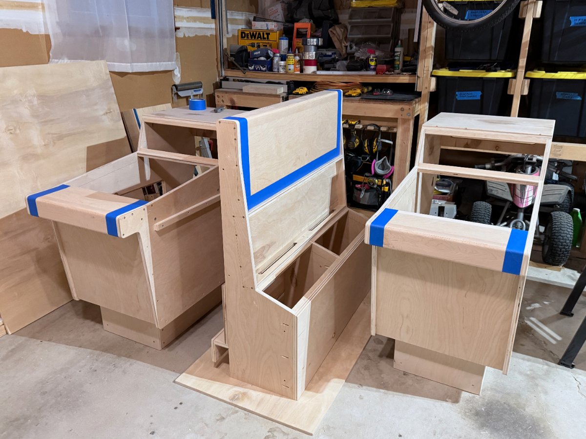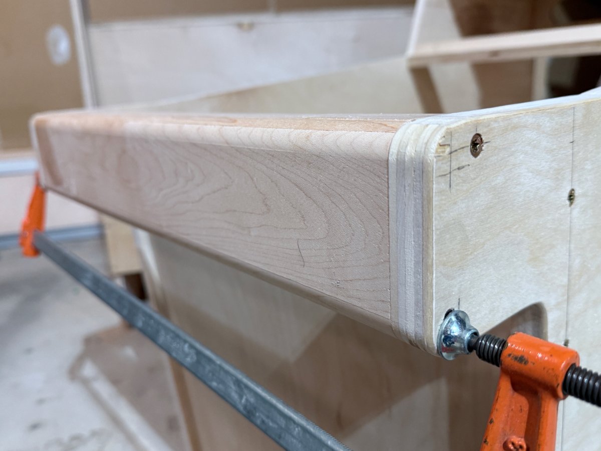 This was a complicated glue up. I wanted to make sure the arm rest was robust, my last edge. was pine and didnt hold up well to wear and tear. This time I made the arm rest out of 1x4 & 1x3 maple, wrapped around a 5/4 stock piece of pine for reinforcement. Glued them, trimmed them down and used a roundover bit for the first time. I think they came out fantastic! The maple was so great, a stark contrast to the absolutely AWFUL home depot sandee ply that I used for the rest. At $80 a sheet, that is the worst "furniture grade" plywood I have ever used. It has so many knots, some of the layers were pressed incorrectly and overlapped causing bulges, and it delaminated like crazy. Not good.... but I made due.