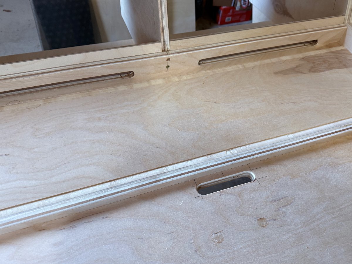 Just a shot of the complicated glue up here for the front rail as well as the SSL tray. Was critical to get these correct as there is a slight angle to the tray (about 5 degrees) so took a bit to fit it up perfectly. Then I glued and screwed it all together.