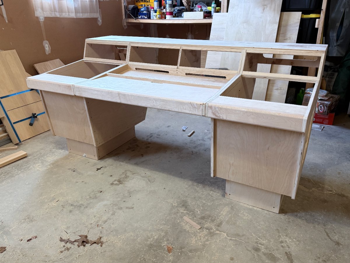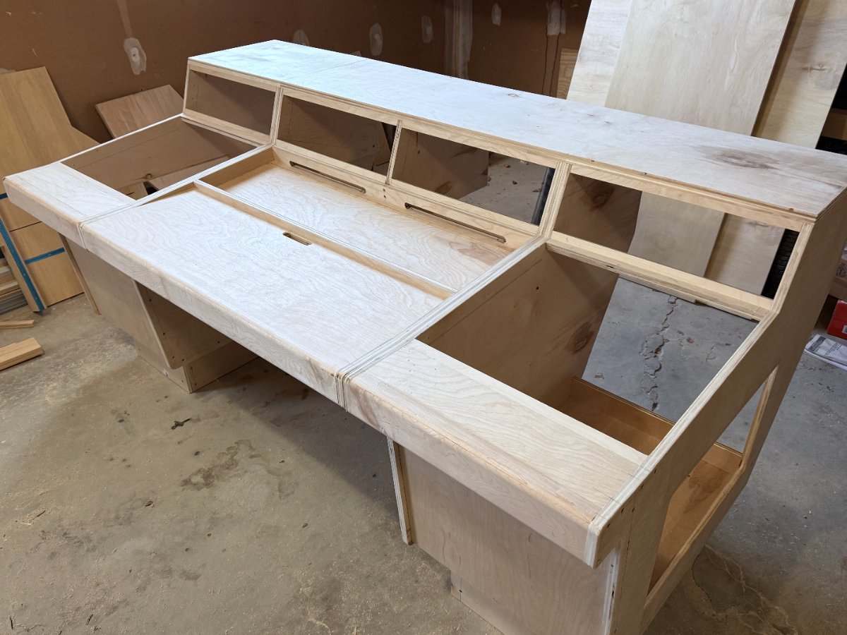 Well, I finally finished building my studio and I really wanted to update my desk to move my amazing SSL UF8, UC1, and UF1 controllers up from the keyboard tray and into an embedded prime location on my desktop. Also needed a bit more rack space, so wanted to upgrade from 24U to 32U to support my GAS. The following is what I designed, and how it ended up being built.