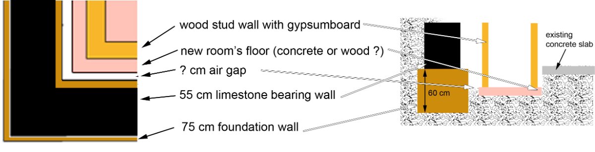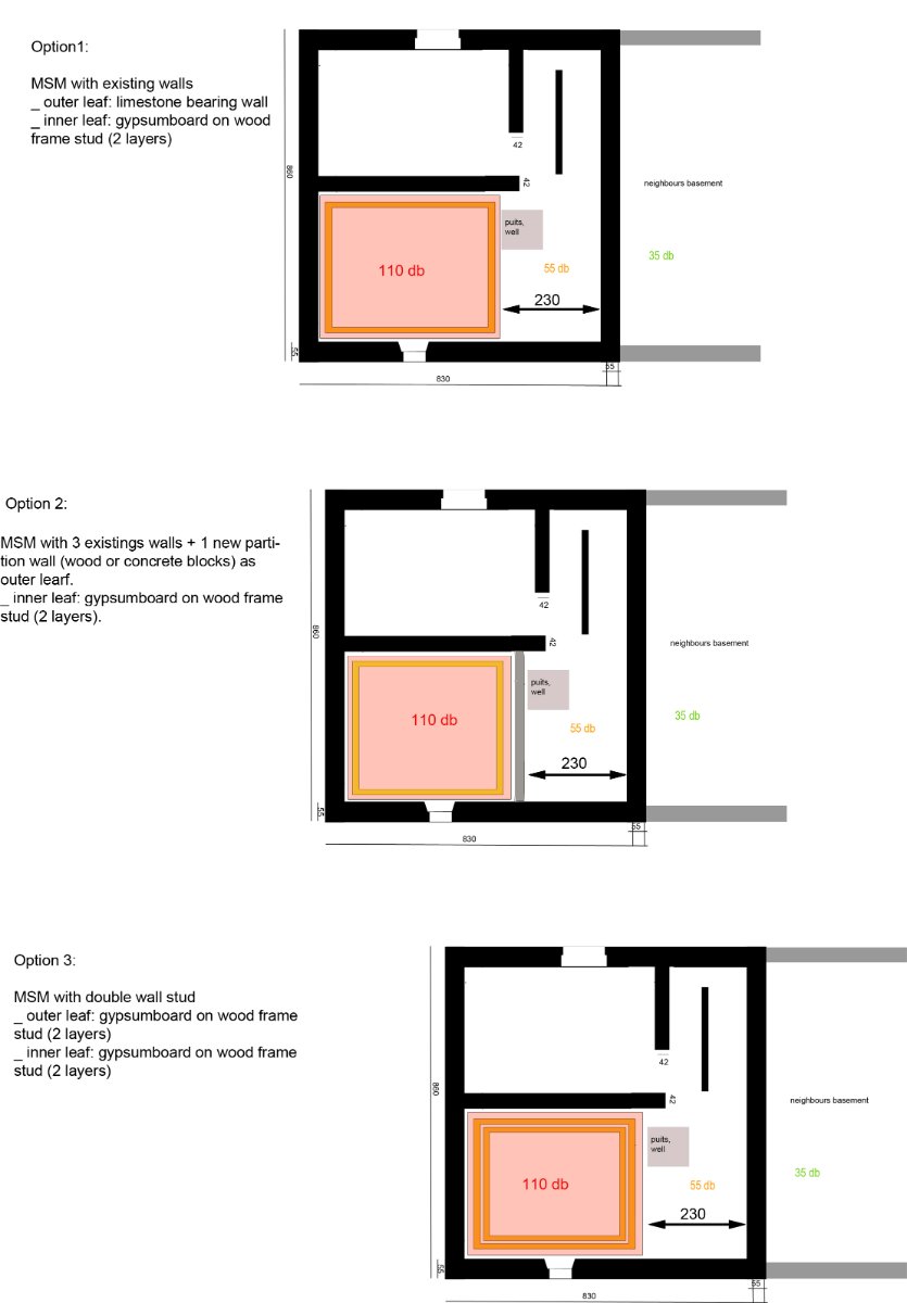 _ First is to determine the sound transmission loss in the common wall and in the basement (resonant frequency and critical frequency as well). This will conduct me to choose for a particular type of design: the room in a room (and even more questions about the MSM system).