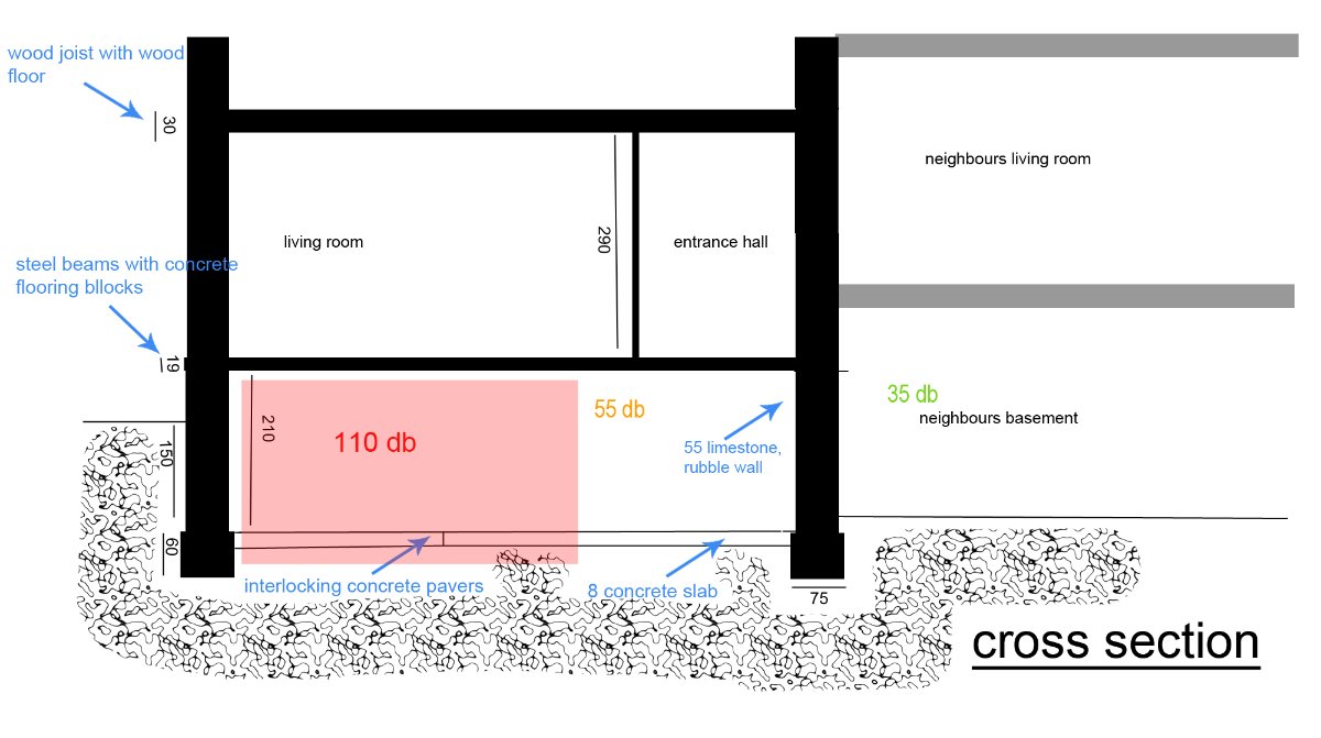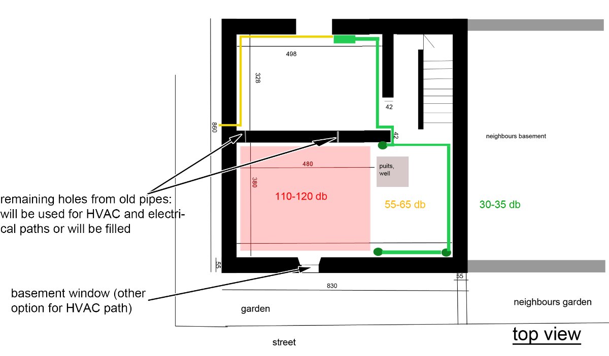 The house is located in a houses neighboorhood with two streets (level of noise outside in daytime : 50db). The basement walls are underground/below grade with the fourth wall (at right)being common with my neighbours' basement. The environment sound level in my basement without noise (washing machine, etc,...) is around 30-35db (measured by iphone app...). With the washing machine on, it rises to 55db. The sound level in the neighbour's house is approximative because I won't be able to do measurements in... because of bad relationship with my neighbours...