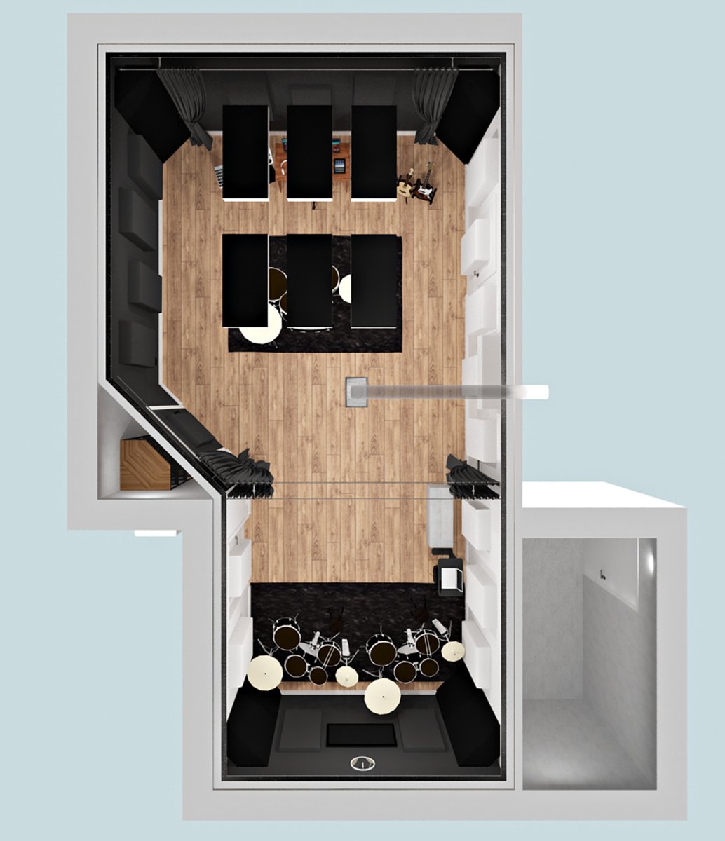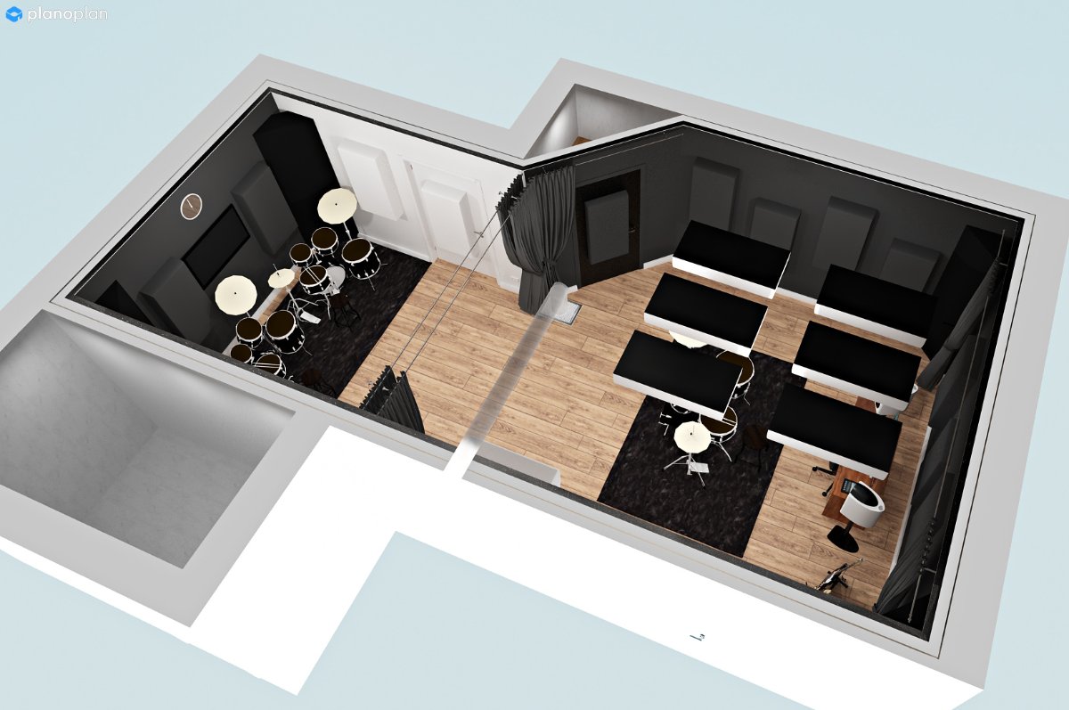 • The goal is to use the larger area for predominantly recording and some mixing, while having the smaller area for teaching drum lessons.