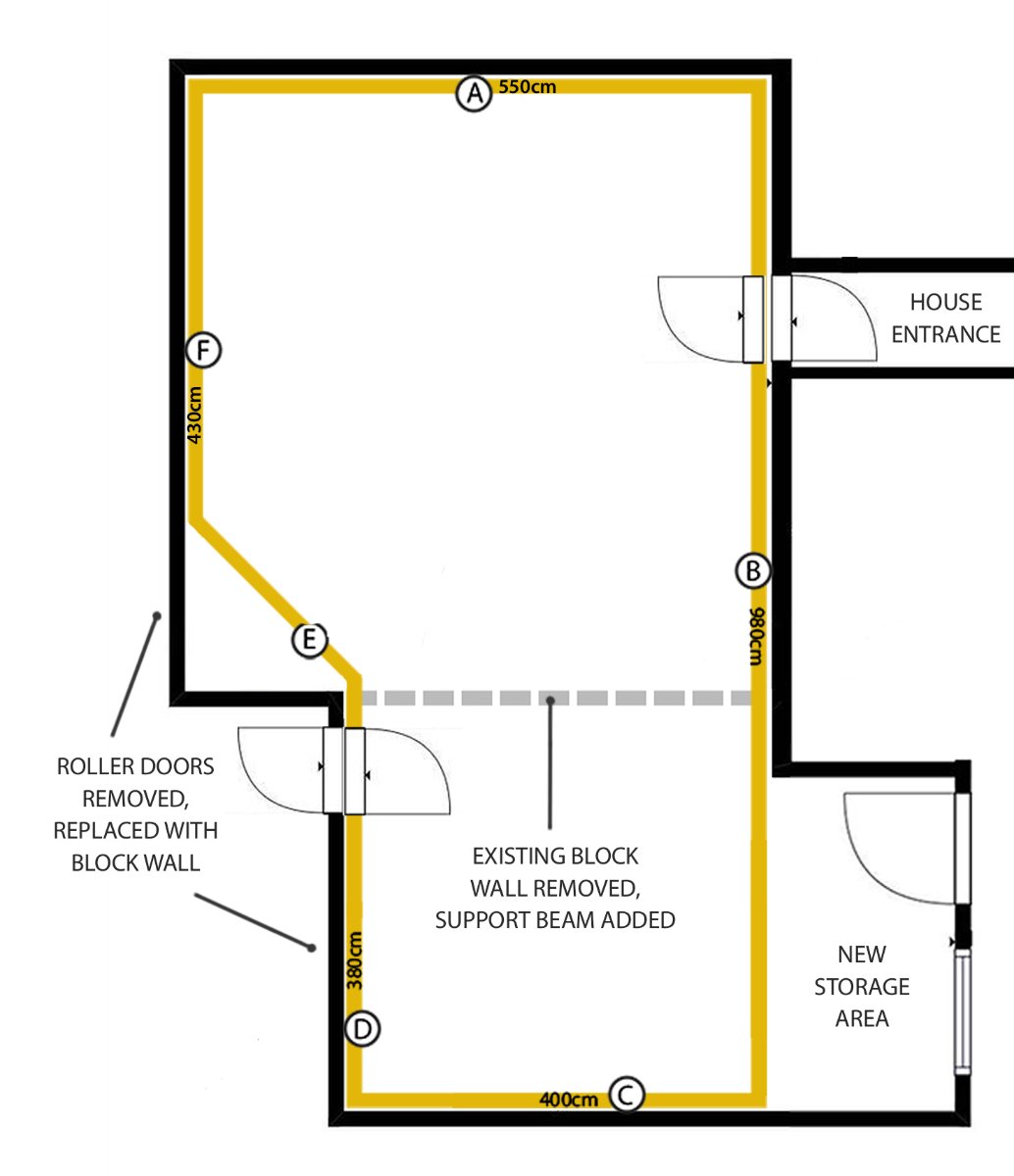 As mentioned, this will turn my triple car single storey garage space into a recording and practice studio (mainly drums) by creating a room within the room using a 2 leaf system, while leaving a small amount of the garage space adjacent to wall (B) for general storage.