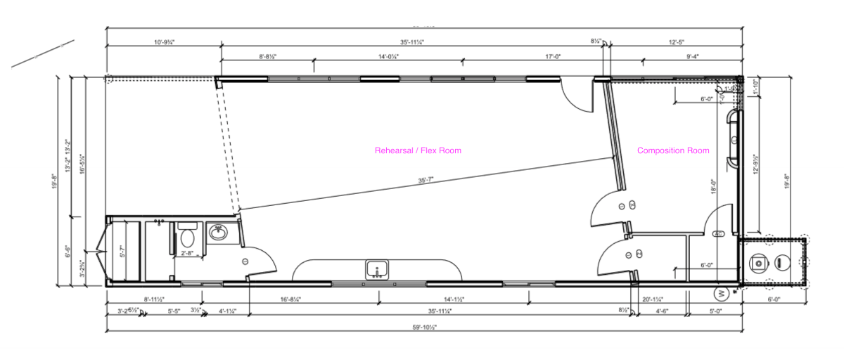 The design currently is to divide the space up into two rooms (not including bathroom and closets): a "studio" space for my wife who will be primarily working at her desk and computer as she creates and masters music. This is the smaller room, which will have some sound-proofing - a double wall between this and the larger room, as well as some sound insulating windows. It is not necessarily a "control room" or " voice booth" designed to have total and utter silence - though she does frequently record herself singing as she creates music. For this room, we want to strike a balance between good sound control and an inspiring and creative place to be. That is - we don't want the room to be a dark, artificially lit cave, as she will be spending most of her day in this room.