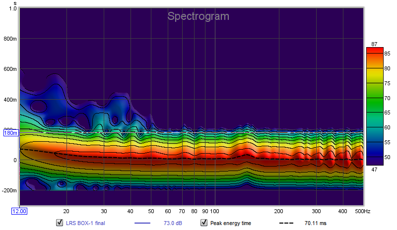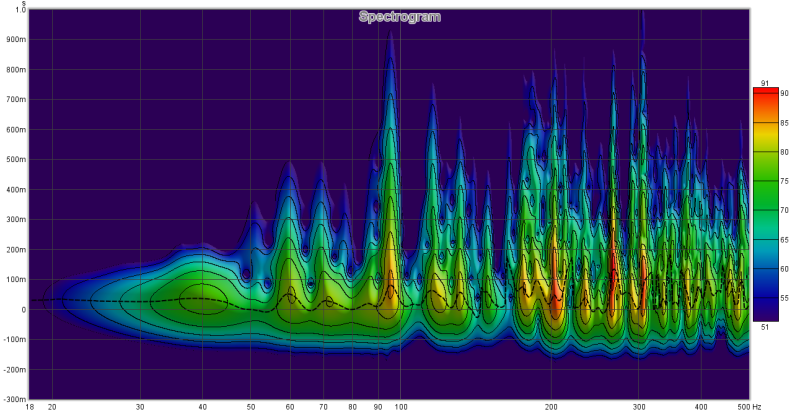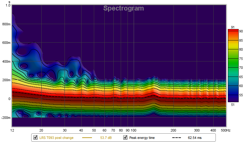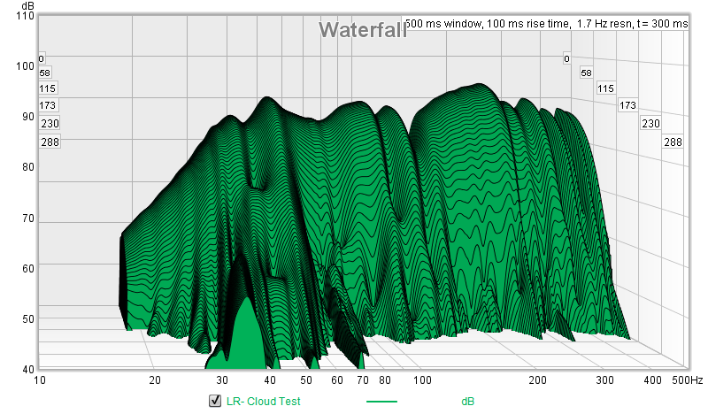 Soundman2020 wrote:It is ALWAYS hard to produce a good RFZ in most small rooms!However, I’ve tried that before and it seems that it is really hard to get a good working reflection free zone that way if I only use an angled cloud instead of the two angled plates that are connected to the flush mounting baffle.But it's a lot easier if you have a cloud that you can adjust the angle of, to tune the room as needed. In the room for the graphs that I showed above, I initially go the angle wrong, and needed to adjust it. I was getting unexpected reflections (I still don't know where they came from), but changing the angle of the cloud fixed it. And it also fixed some other issues. Clouds can be used to do a lot more than just establish an RFZ: The can also be used to smooth out bass issues, for example. Sticking to the example of the same room, here's the "before" and "after" waterfall plots regarding the cloud: You can clearly see the huge improvement in the low end. Clouds can do lots of things: CID panels can't.