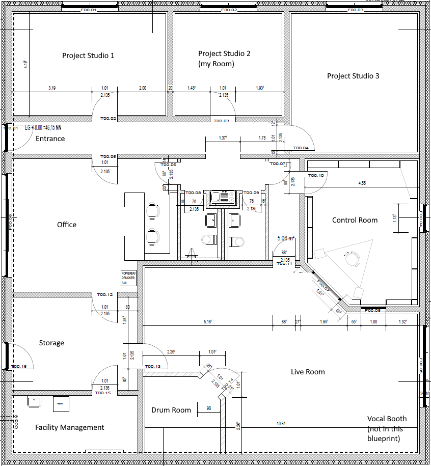 The main goal is to have a reliable acoustic environment for stereo playback. My main focus will be mixing and producing in stereo. The second (future) goal will be to have the possibility to expand to 5.1 surround for film score mixing. Spoilers ahead, it is impossible meet the requirements for this approach in this particular room, regarding the recommendations based on the “recommendation for surround sound production” I’ve downloaded somewhere. Never the less will I try to mix in this non-perfect environment in this format, because the benefits of this room are in fact the other rooms in the facility I have also access to.