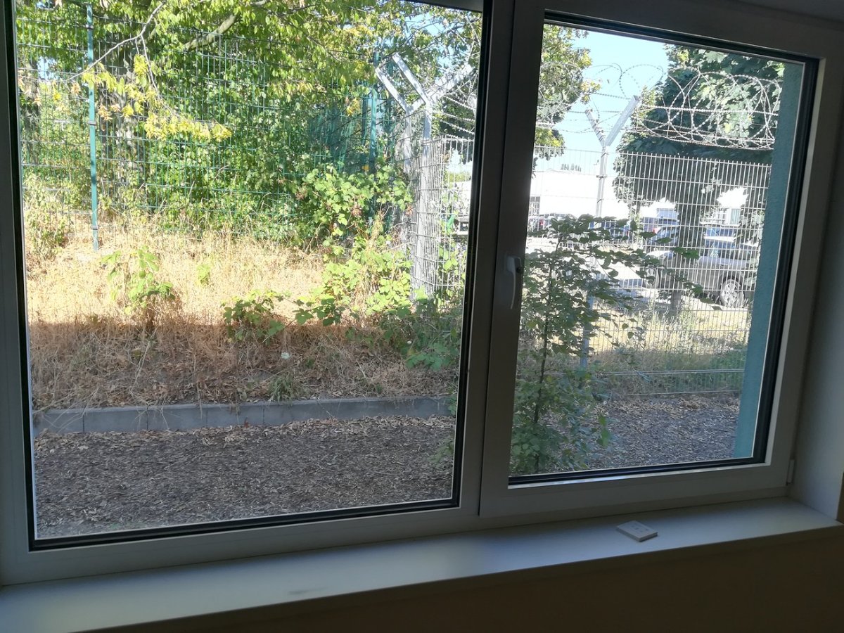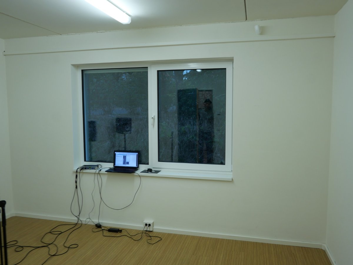 The window is a double sided one, and the right window (viewed from the entrance) is able to be opened. Honestly, I don’t know exactly what kind of glass is used, but it is heavily rigged, 2 leaf insulated as far as I can tell. The room was intended to be a drum rehearsal room, so the owner paid attention to a good insulation to the outside world.