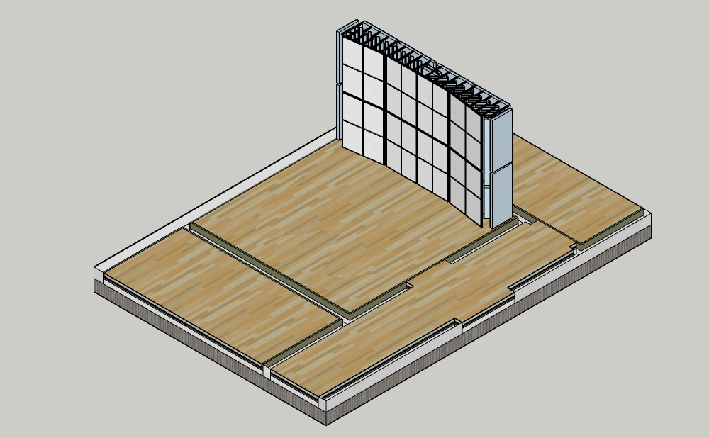 Like I've described in the chapter "The outer framework" The whole construction is not touching the walls and ceiling. This leads to the problem, that the front and the back site of the baffle is not sealed, which is absolutely critical to my understanding, because this will act like a giant vented port for the very low frequencies and therefore has a resonance. To avoid this problem, my Idea is to use memory foam stripes which will seal the front site from the back side (except the intended false wall on the ground and the hot air shaft for the speakers). I've read that the damping properties are quite good, and that there is a type of memory foam that don't let the air thru because it has closed bubbles (different to Basotect, which has a capillary structure). Also, the vibration of the structure doesn’t get much derived to the room walls and ceiling. So hopefully, I will not bypass the floor impact protection significantly with this approach.