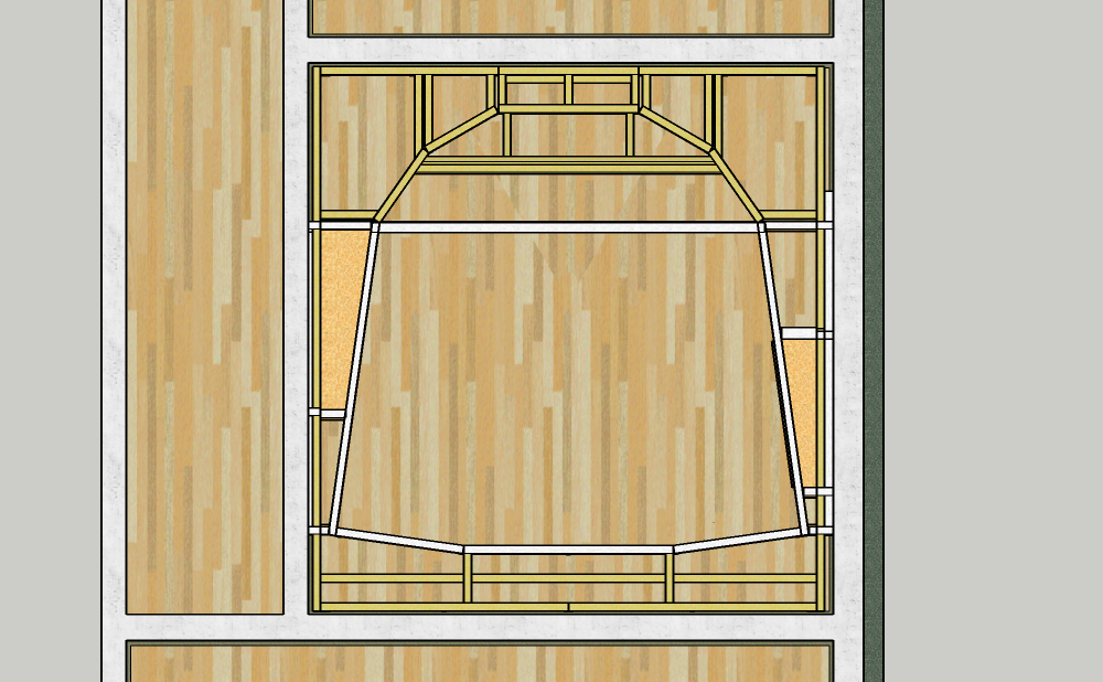 This framework will hold the angled structure, which will house the speakers and the baffle of them. This was the hardest part to get working, since I wanted to avoid as many angled slats as possible. The construction I've intended will be just frames with 90° angles, which are connected to the outer framework via angled slats. With this approach, the only not - 90° - angled slats are the ones that connect the reflection free zone framework with the outer framework. Thos slats are also relatively short and I only need a mitre saw to make them.