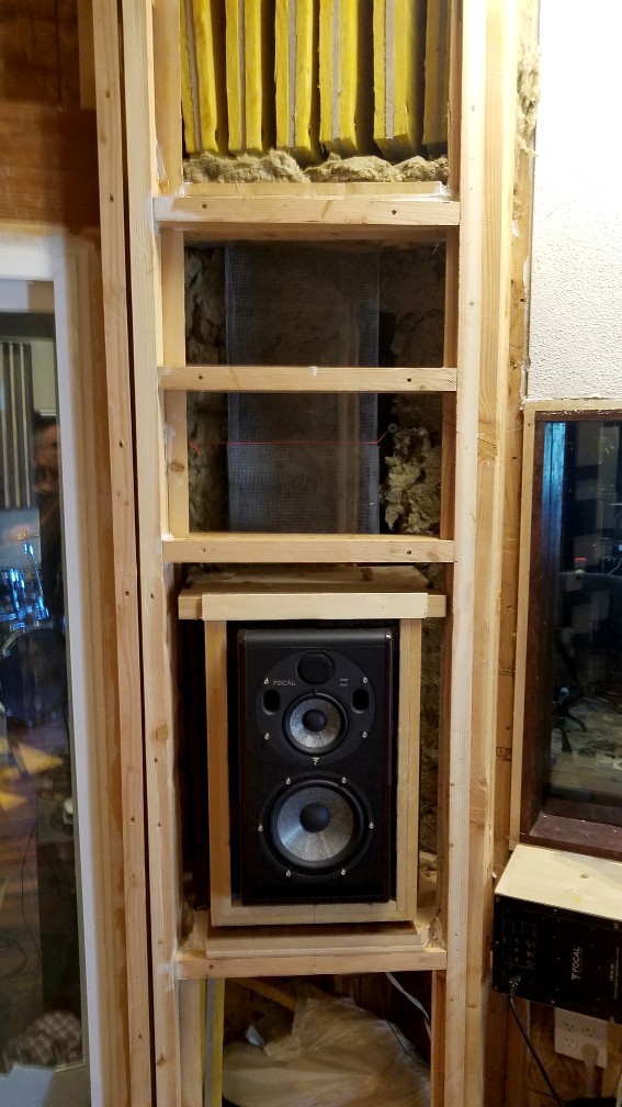 This part of the room will approximately occupy 30% of the room. Behind the flush mounting baffle, there will be a big array of hangers, and where are no hangers possible, the space will be filled with rock wool or glass wool, depending on the measurements. The hot air from the amplifier of the four loudspeakers behind the baffle will be guided outside with three 10 cm air tubes (those ones that are intended for tumble dryers) and guided to the place in the ceiling where the hot air is sucked out of the room by the (future) HVAC.