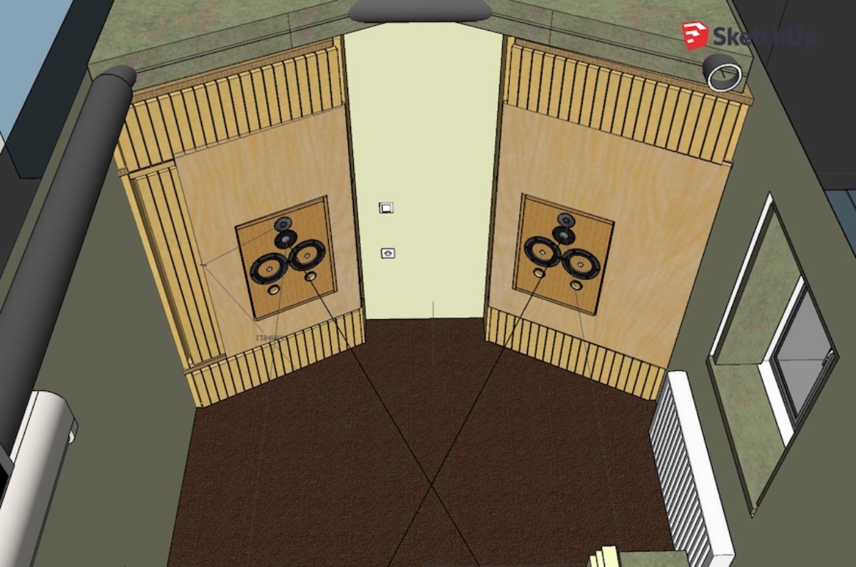 1) Planning the final layout many different configurations have passed though my sketchup and I ended up that the safest one for my limited space is with absorbent reflection points (30cm insulation) and full absorbent ceiling (30cm insulation), see previous post. I keep reading that insulation alone will not suppress the early reflections enough end the proper way is to redirect them, something that I am unsure if I can accomplish in this room. Will I gain anything noticeable if I embed hard reflective surfaces inside the insulation on the reflection points?