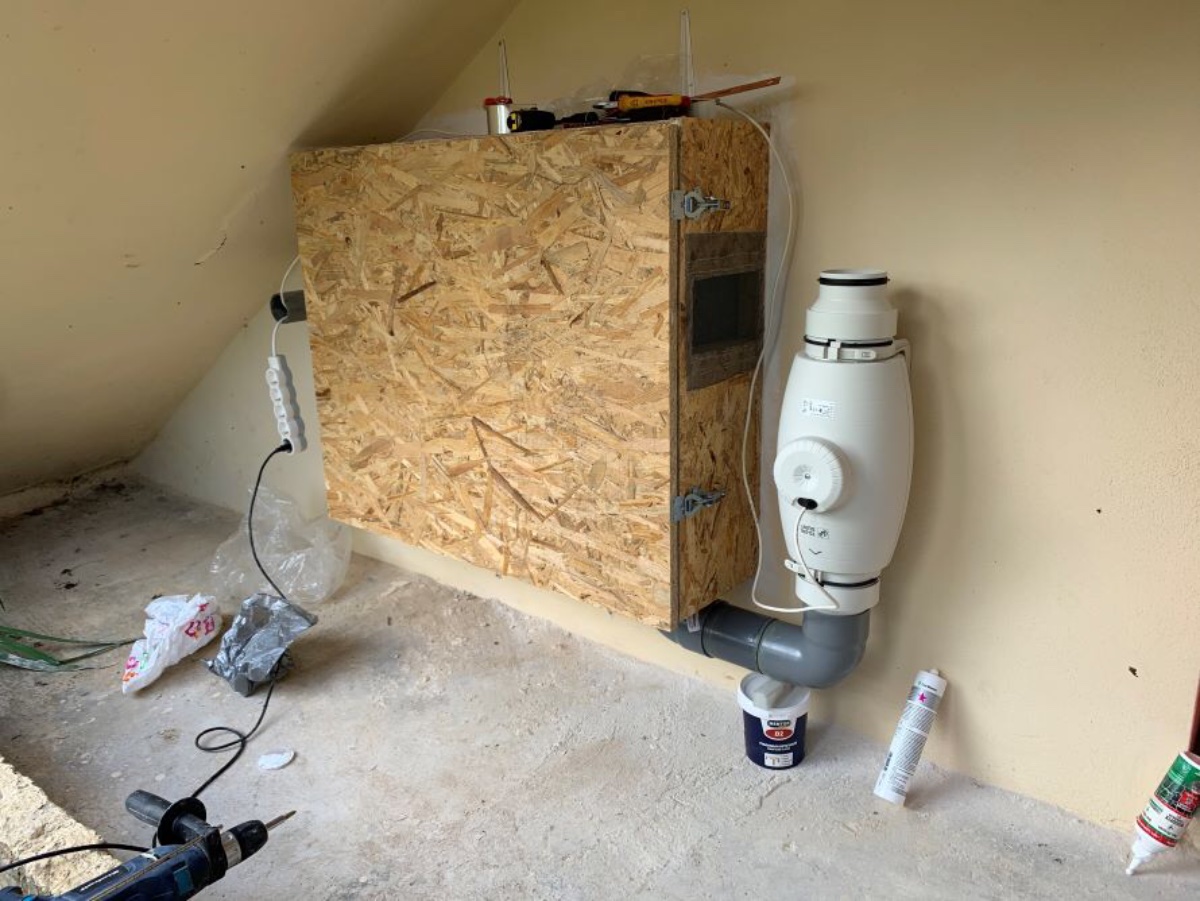 Then, I made the "on-wall" silencer and connected the fan. Being aware of the Murphy's laws I made the silencer internals visitable. Playing loud music (~95dbC) inside the room corresponds to about 56-57dbC at 1m from the silencer. I wouldn't call it bad performance for a start.