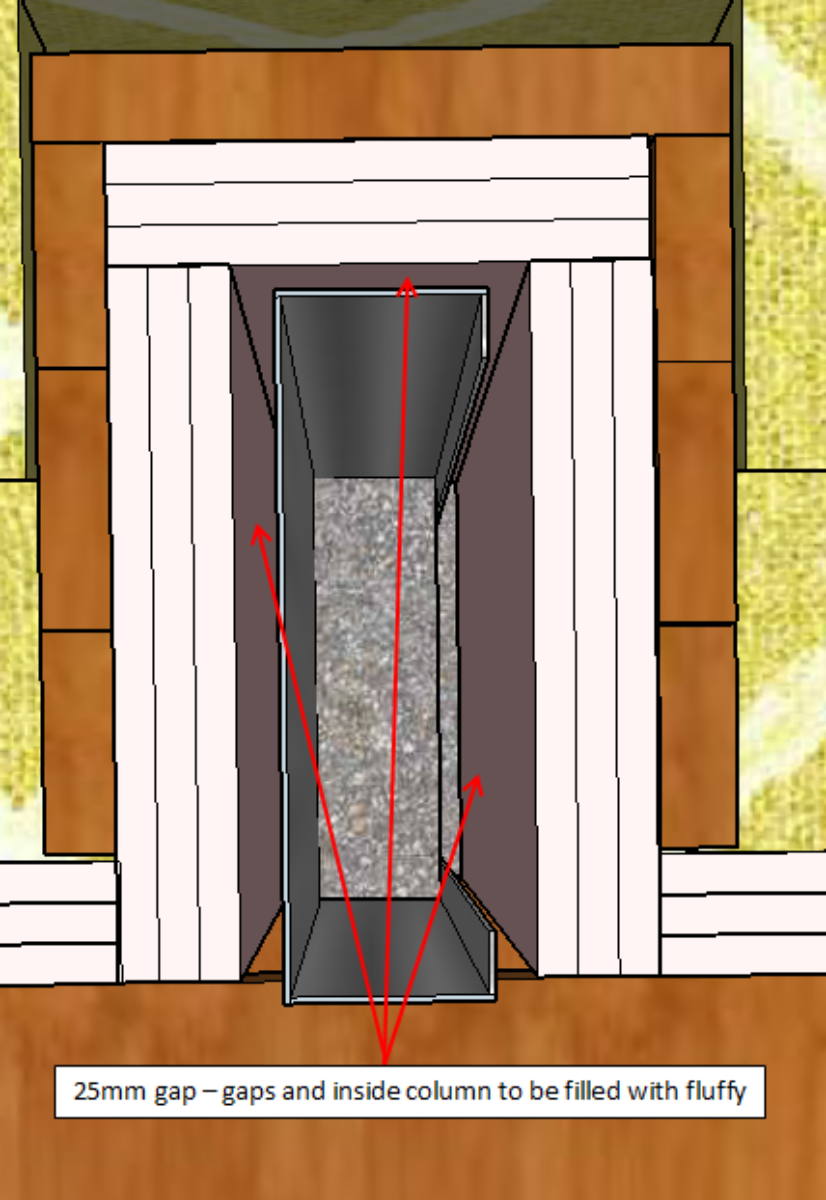 2. More critically, my cladding will be screwed to the outside of the outer timber frame so my first isolation leaf has to sit on the inside of that timber frame. This timber frame itself also has to sit on the outside of the column - as that lines up with the beams above.