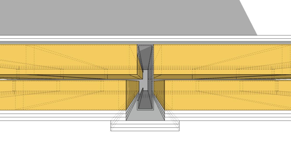 so - 2x6 walls between columns. exterior mass plus optional inter-joist mass. 25mm air gap to interior frame. 2x6 frame interior wall with mass on the inside. don't worry about the box inset on the column in the CR. that will be corrected with the acoustic treatment overlays.