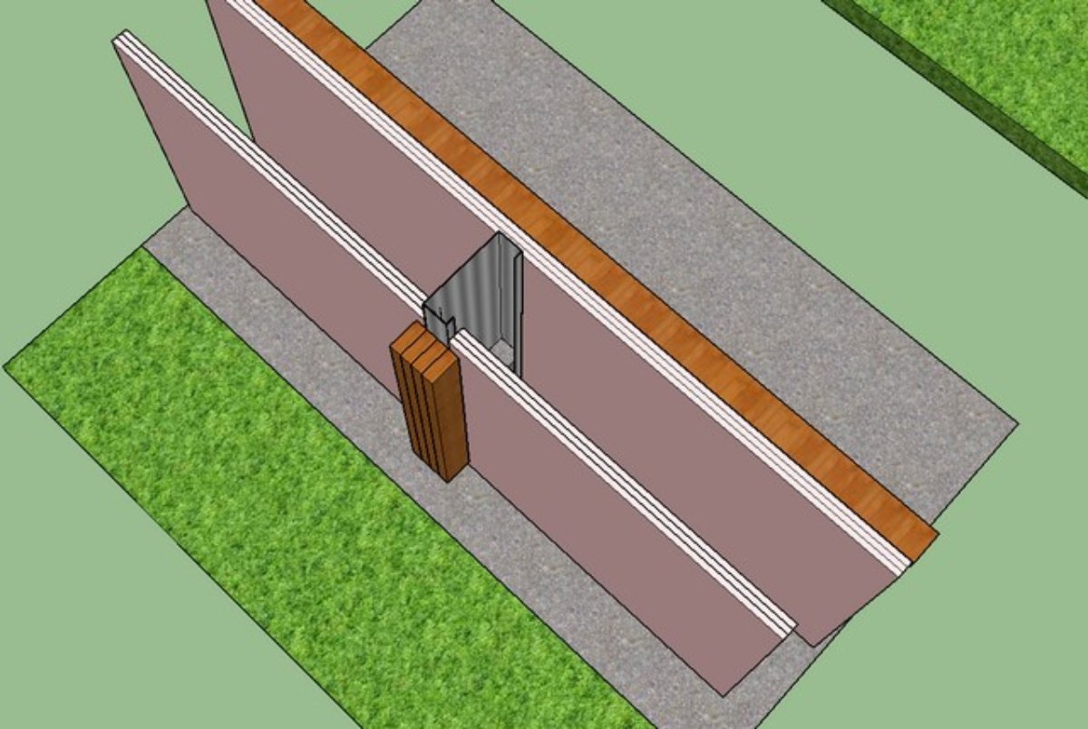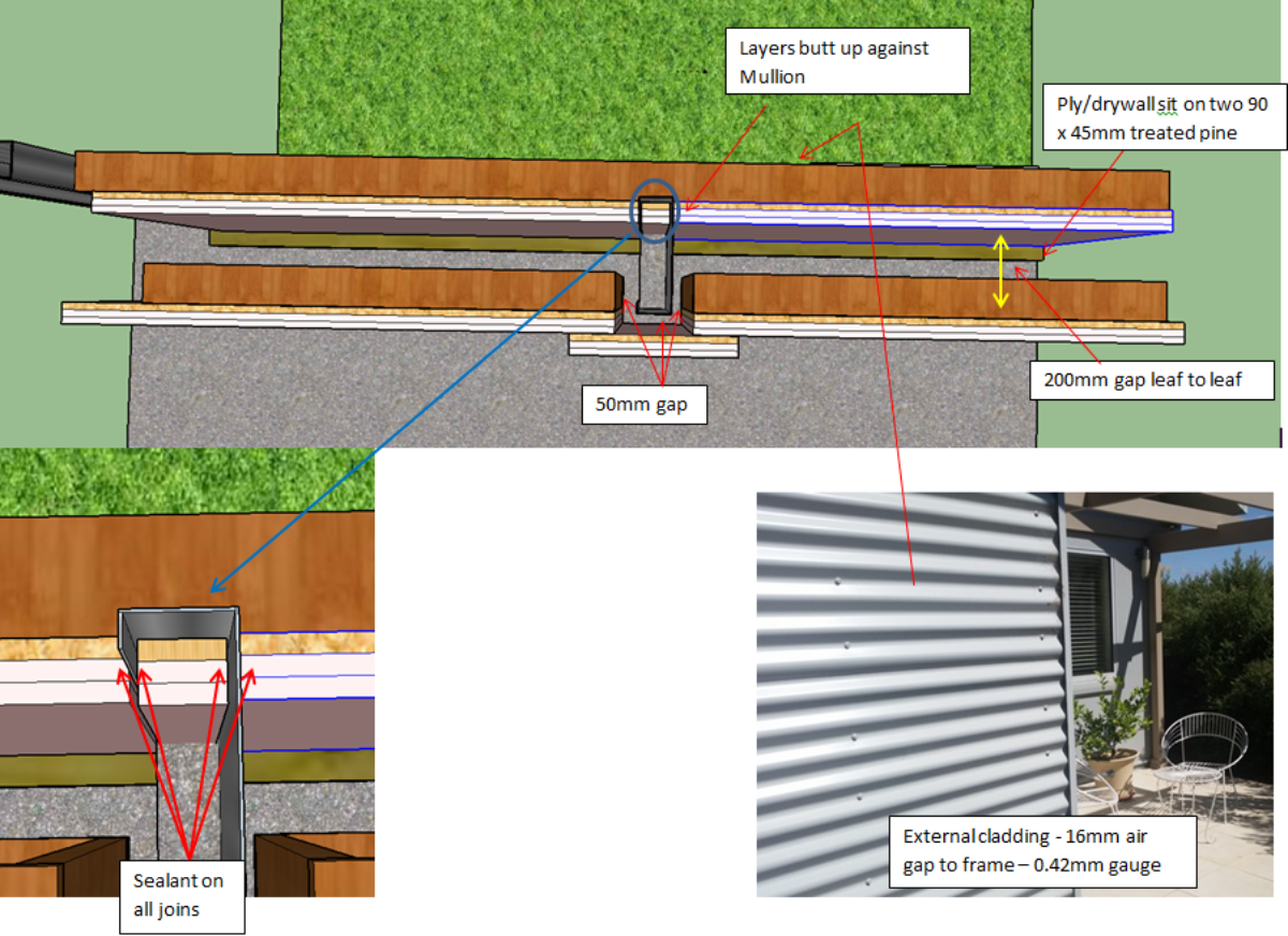 Option 3. Move to a hybrid structure depicted below where I bring the outer wall inside the frame and have it sit on the 2 layers of 90 x45 as described in Option 2 above. This gets me a continuous mass; brings me to the same position in the room as Glenn’s design; and gives me an air gap of 200mm – my target. I have included a shot of the cladding rather than try to do it in sketchup - while it could be considered a third leaf is has very low mass (.42mm thick) and air flows freely behind it