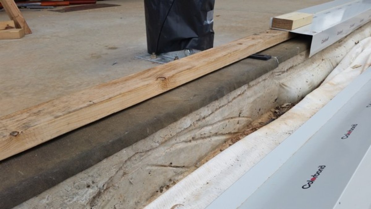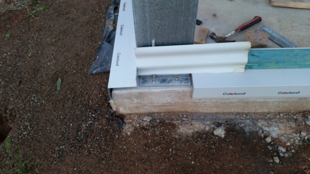 You can see in this pic below that there is air space between the base plate and the DPC – the 10mm packer sizes it at this point - there are other packers but they are in the shadow under the timber. This is due to variability in the slab. This means that for the majority of the perimeter the only surface between the outside world and the inside of the outer wall is 0.3mm of aluminium – the DPC. (What I was going to do in my original design was to lay down some extra base plates inside the current one with a DPC and plenty of caulk underneath. The outer leaf was to sit on this. The bottom 90 x 45 would be planed to get close to the slab profile so that the gap underneath stayed manageable for the caulking/sealant underneath and the top would be level.)