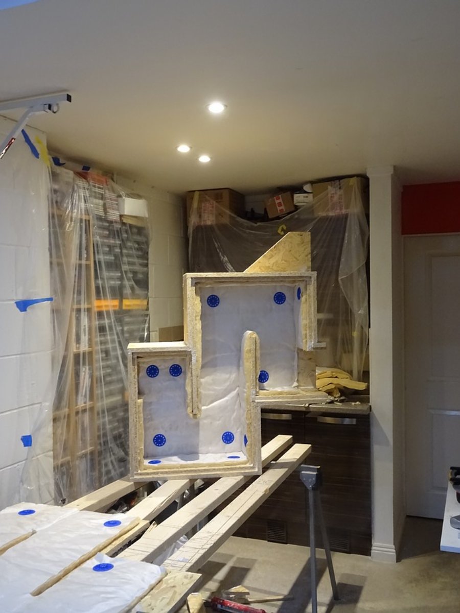 The intumescent grill that faces in to the room has to be attached in a very specific manner to preserve the fire rating. Brackets and screws of particular dimensions and type were detailed in the fitting instructions. The gap surrounding it must be filled with intumescent sealant. This grille is 200x200mm, not large enough to get the airspeed to under 300 feet per minute at 6 air changes per hour. No matter though, it is only a way to get air through the wall, there will eventually be a larger register here as part of the soffit.