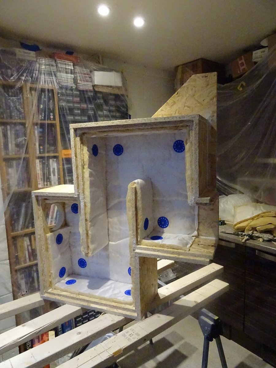 I took a day off on Saturday for R&R. Sunday I finished the plasterboard on the rear knee wall. It now has one layer of 18mm OSB and one layer of 15mm acoustic plasterboard all over. Green Glue between them.