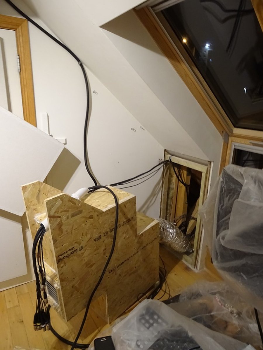 Spent the morning crawling about the roof eaves verifying the planned duct runs were realistic. Decided to go for a longer route of flex duct with very gradual turns rather than a shorter route with sharp turns. Did some tidying up in there, and used the circular saw to trim back the tongue and groove floor around the front knee walls to allow for a double layer of OSB + plasterboard. Previously there was just plasterboard. Also did several other small but necessary jobs preparing to fit the silencer.
