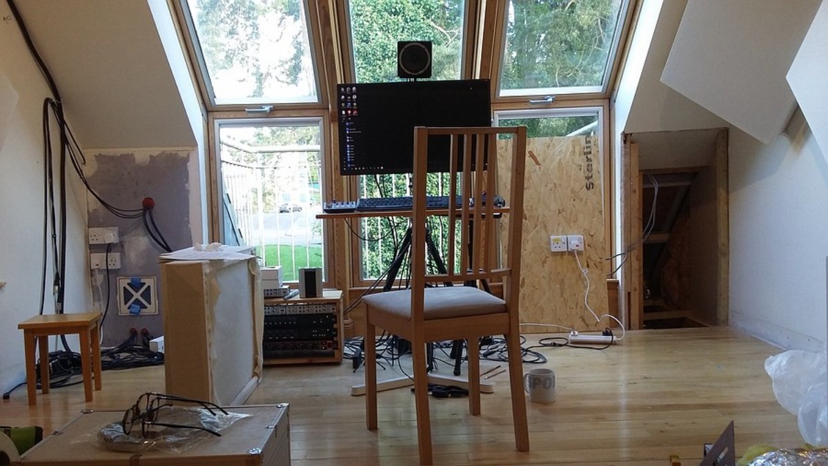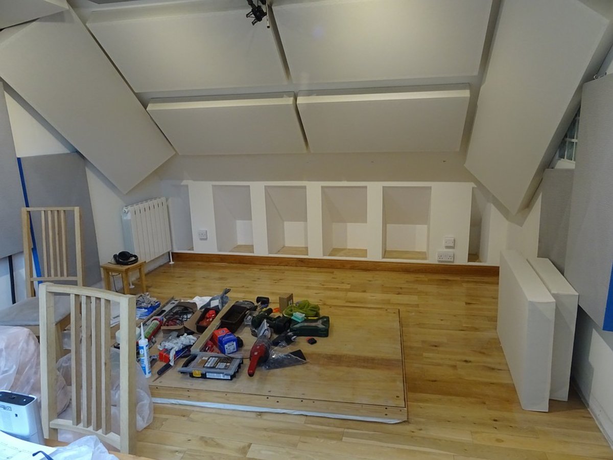 The other test was a reference track, Peter Frampton's "Show Me The Way". It's useful as it has a very dynamic kick drum & bass guitar that cuts through boundaries like butter. With the old rear wall - one layer of 12.5mm plasterboard, probably 9 kg/m2 surface density, track playing at standard monitor level in the room above, the doof doof of the kick and and bass was very prominent. With the builtin traps, double layer of OSB & 15mm acoustic plasterboard + green glue, surface density around 25kg / m2, there has been a huge reduction in transmission of low frequencies. It really is quite remarkable.