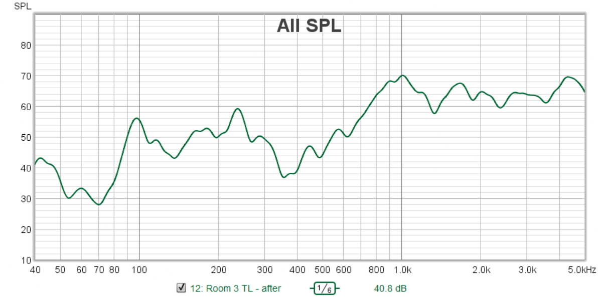 I mentioned earlier doing an ear test of sound transmission to one of the rooms below, the transmitted sound having reduced bass and now being predominantly midrange. I thought it might be interesting to check the transmission loss graph done when the previous simple wall of 12.5mm plasterboard was there - see graph below.