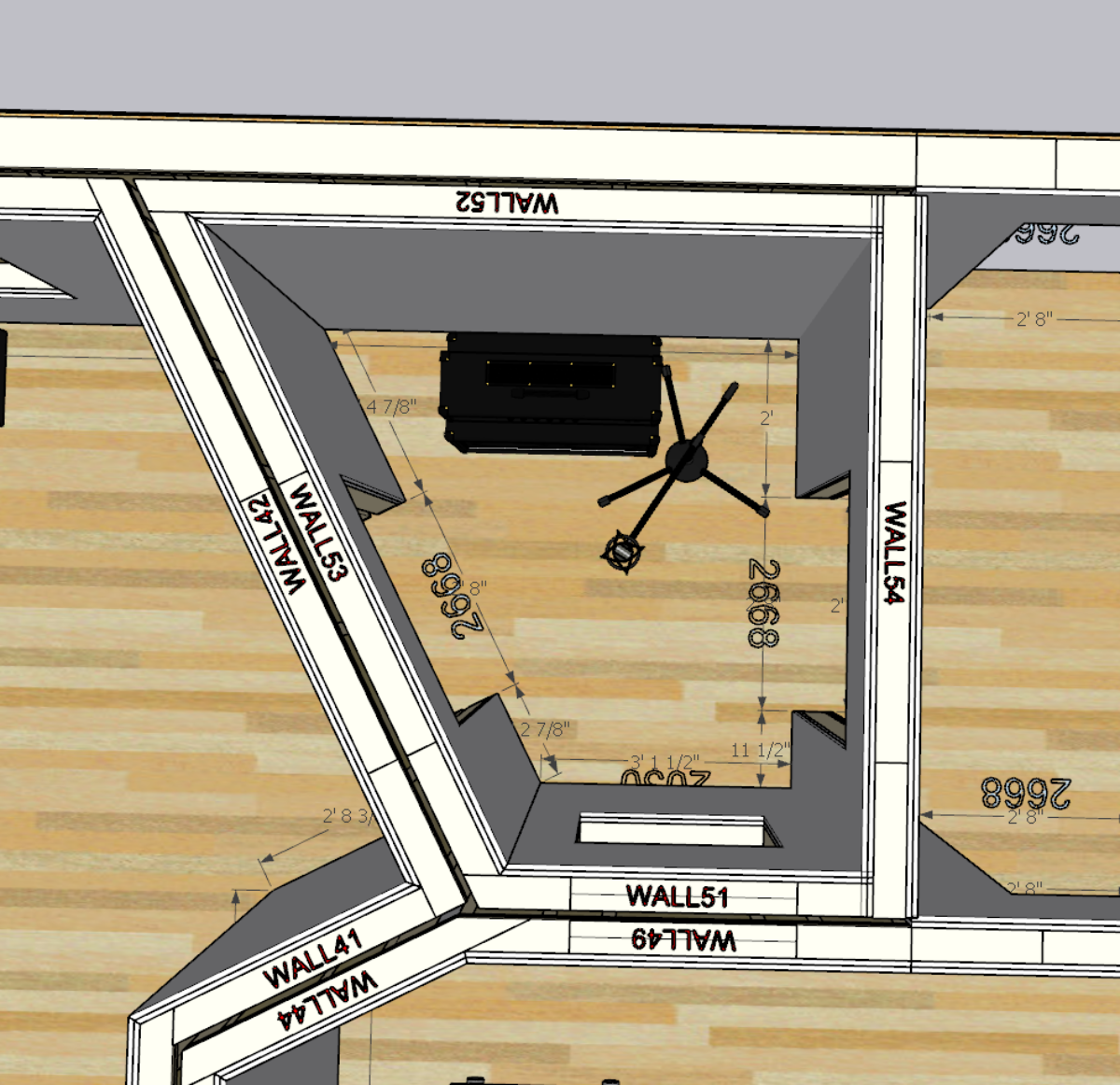 gullfo wrote:Source of the post one note - on the last image - the solid angled walls on either side of the desk - you would get more bang for the buck by making those straight so you can use those corners for trapping or later as part of a soffit mounted speaker system. it would require moving the door into the live room.
