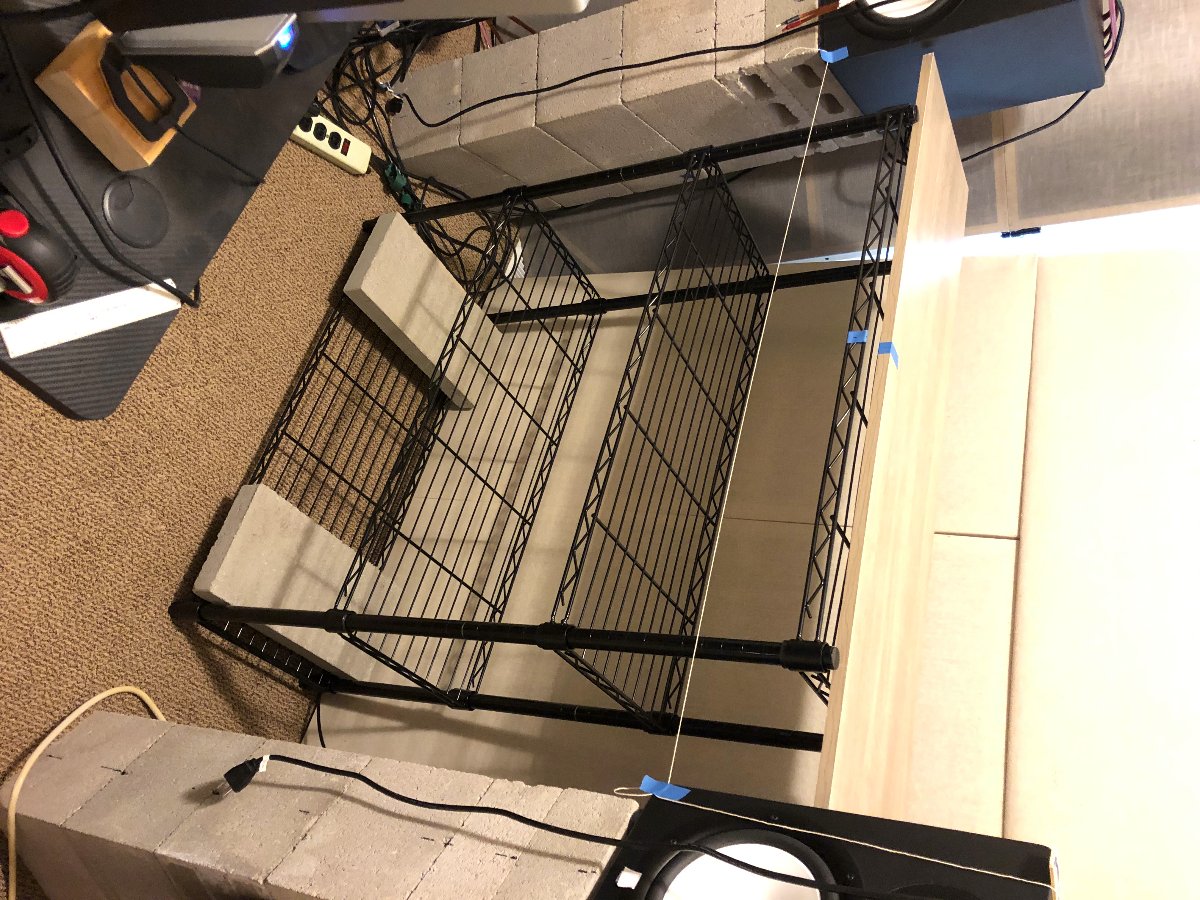 We got the side wall furring strips mounted, and then brought in the corner triangle shelfs that hold the 'chunky corner' bass traps.