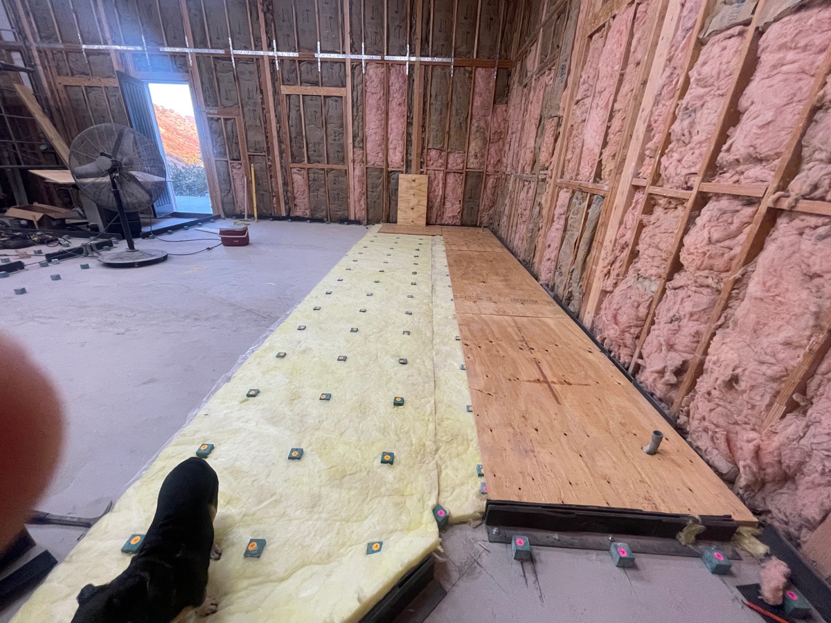 If the 2x AHU are in the attic space above the bathroom(there is a nice room drywall up etc, this space is large enough to easily service the ADU , space for Baffle boxes etc, it is not attached to the studio it self beside the outer shell of the building, or leaf 1. Line sets come down from the vented roof to AHU's, I would then have 2x 16" ducts supply/return per room. I can route each supply and return through the CR wall leaf 1/2 and LR wall leaf 1/2, 4x Large baffle boxes ,these ducts would then be between the leaf 1st and 2nd ceiling leaf, I would then have leaf 2 of the ceiling left to penetrate. from there I would have to have a baffle box per resister.