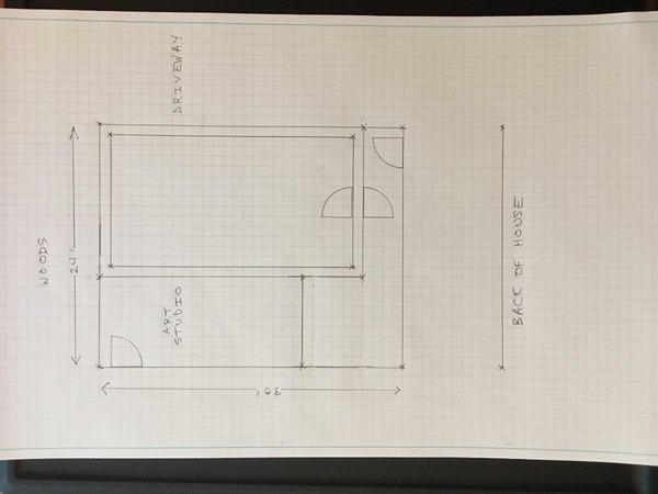 For clarification, there will be an enclosed screen porch between the house and the studio building, and moving equipment through it would be a pain (porch screen doors are usually on the narrow side; the doors in my drawing are 36").