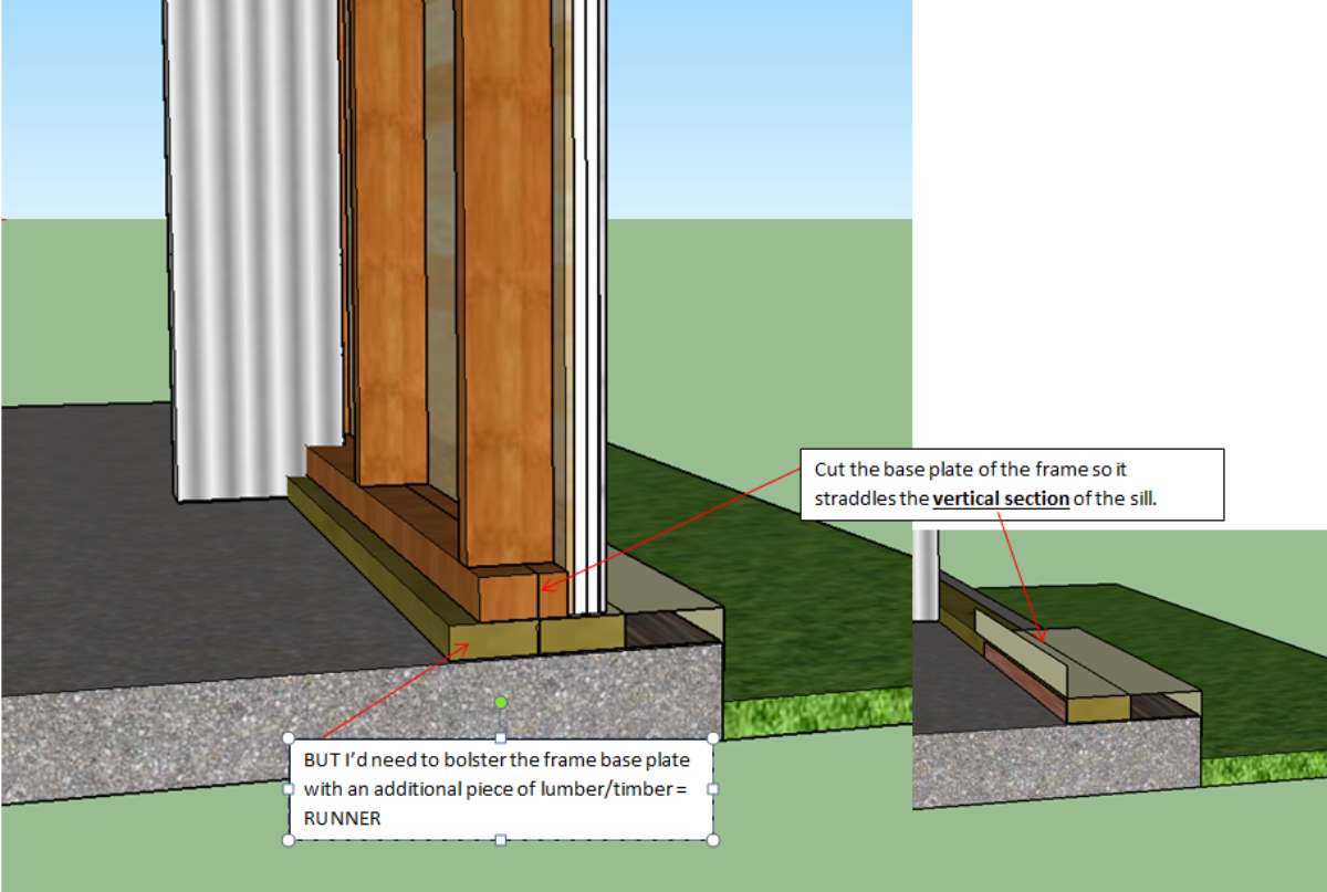 In terms of shifting in outer wall frame position to accommodate the mass outside – my first reaction was that I’d have to have to replace the metal sills I’ve got sitting on top of the treated base plate (pic below) – they have been rolled to suit the current frame position – they only just overhang the slab so won’t push inside further.