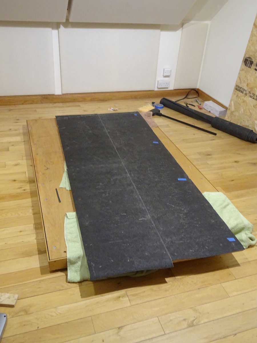 Cutting mass loaded vinyl to fit the door. There will be three layers of this, giving a total addition of 15 kg/m2.