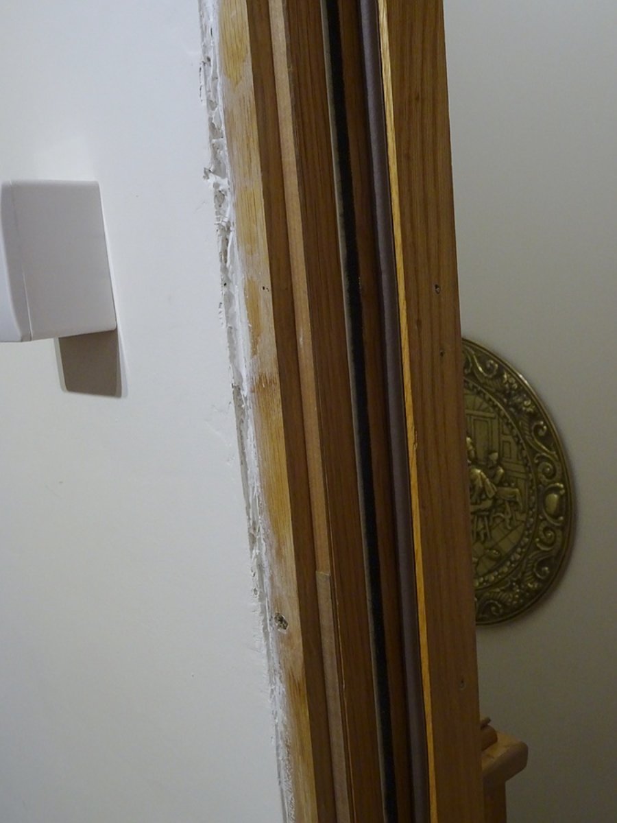 The final seal is pretty good, a big improvement on before, but not quite good enough for a few feet at the off square part. I used a 6mm high D shaped foam gasket, and had hoped it would compress to about 4mm to allow for the off square pull side door frame. Unfortunately there isn't enough pressure from the closer to do this, I'll see if I can find a seal with greater squash variation for the part of the door. One of our exterior doors has an O profile rubber gasket that can go almost flat, something like that might do the trick.