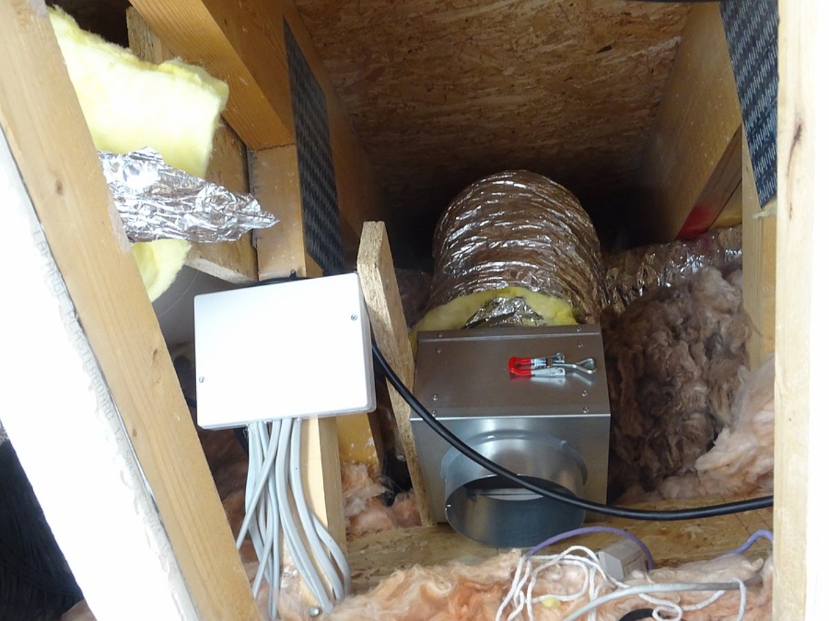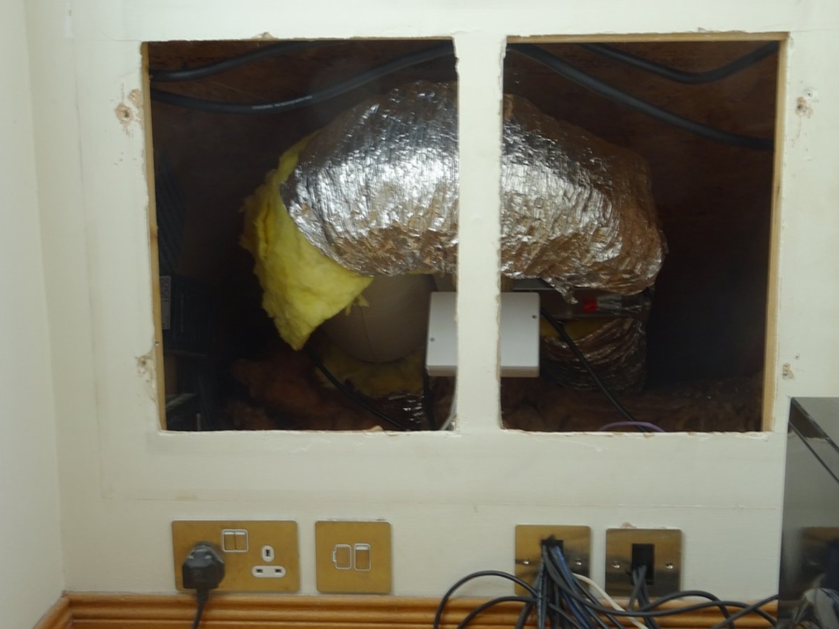 Looking in to the right hand "window" of the hatch, filter box has been attached to the flex duct running from the roof soffit vent. Quite a tricky job that was. The inline fan is accessible through the left "window", attached to the other side of the roof joist.