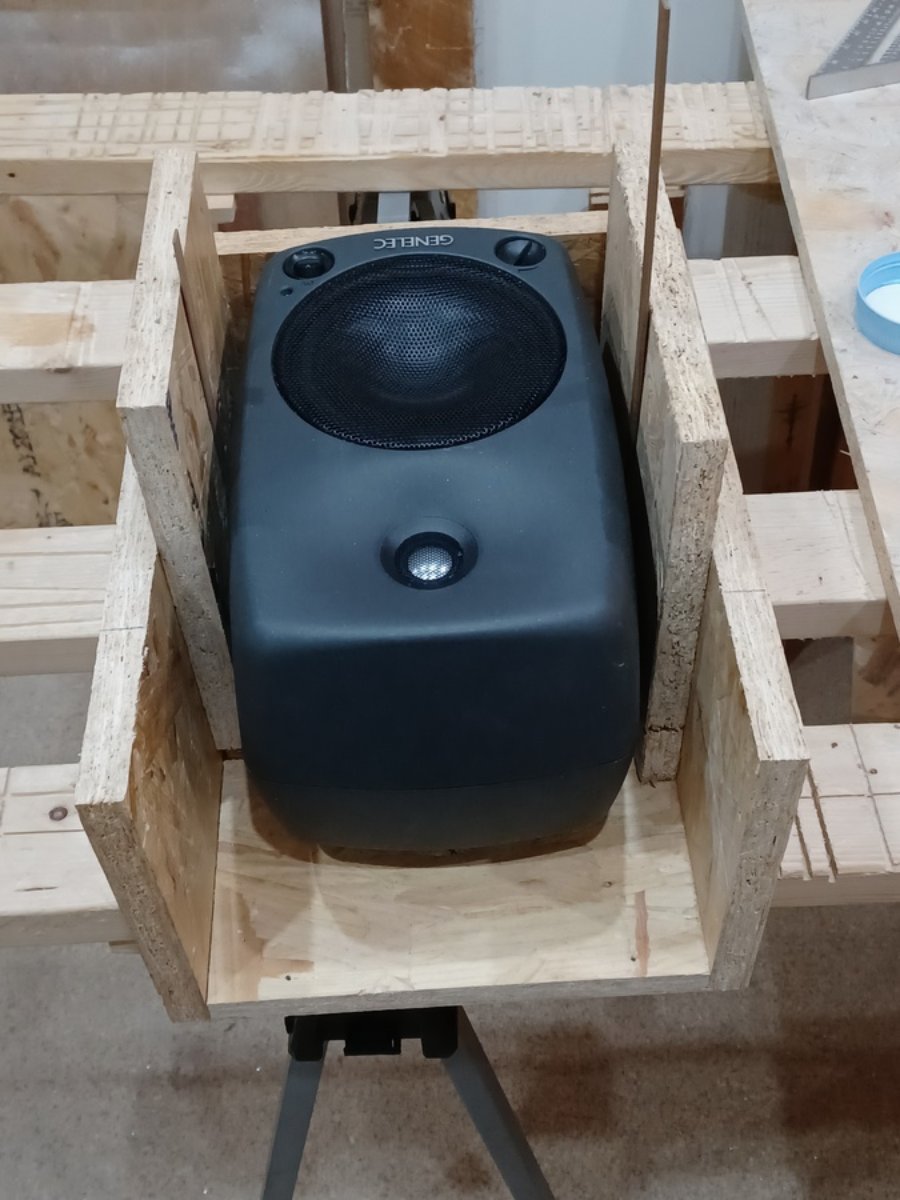 - My line of thinking was that this wall, in combination with the speaker shelf, would make a heavy, sturdy and well damped speaker stand with no direct connection to the soffit baffle structure. Therefore structure borne sound transmission from speaker to soffit baffle face can only happen indirectly e.g. down the shelf prop, into the front knee wall, onto the floor, then into the soffit structure, then into the soffit baffle face.